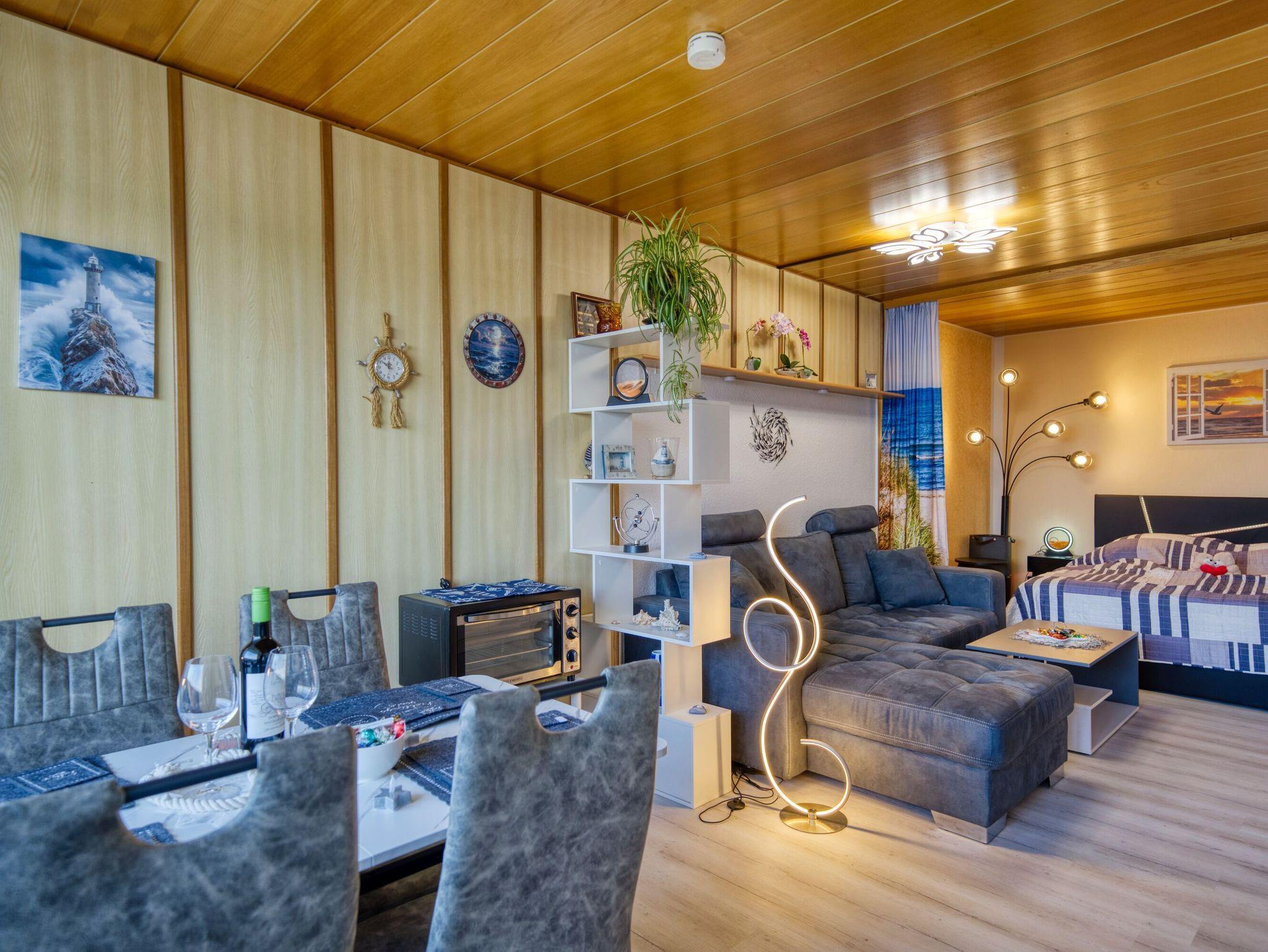 Wohn-Schlafbereich mit komfortablem Doppelbett (180?×?200?cm), gemütlicher Eckcouch, Flachbild-TV und Esstisch vor dem Balkon