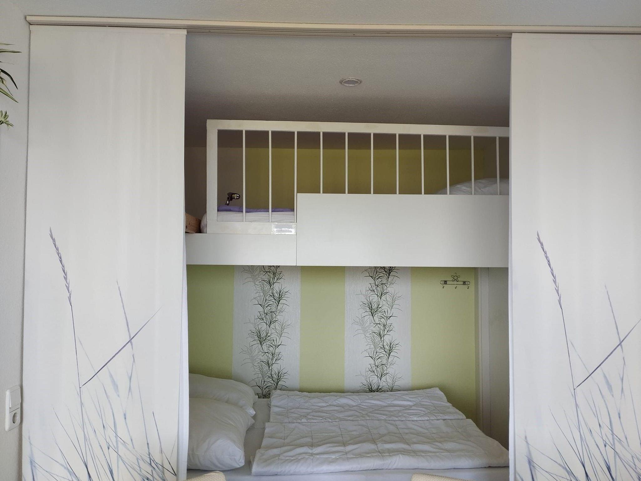 Wohn-/Schlafzimmer mit Doppelbett und Hochbett (1,20 m Breite, max. Traglast 140 kg)