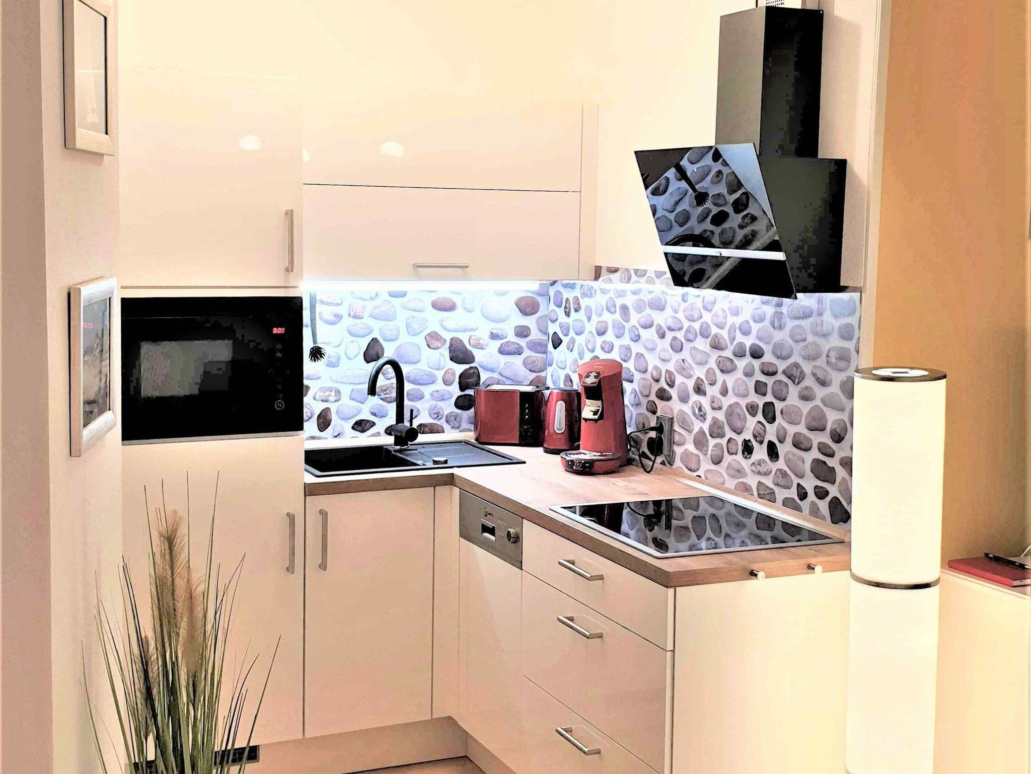 Voll ausgestattete Küche mit Spülmaschine, Backofen/Mikrowelle, Wasserkocher, Toaster, Pad- und Kaffeemaschine