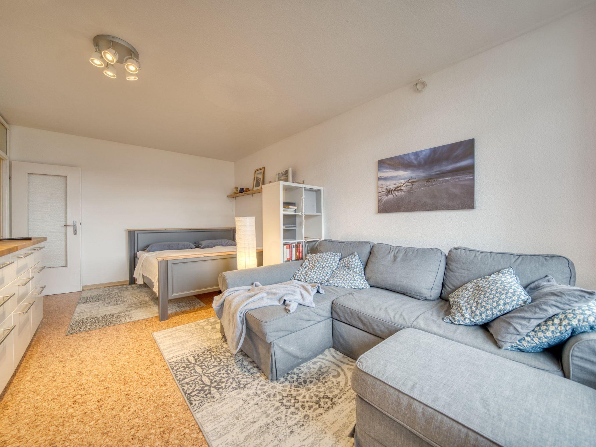 Wohn-Schlafbereich mit Doppelbett und Einzelbett mit Ausziehfunktion