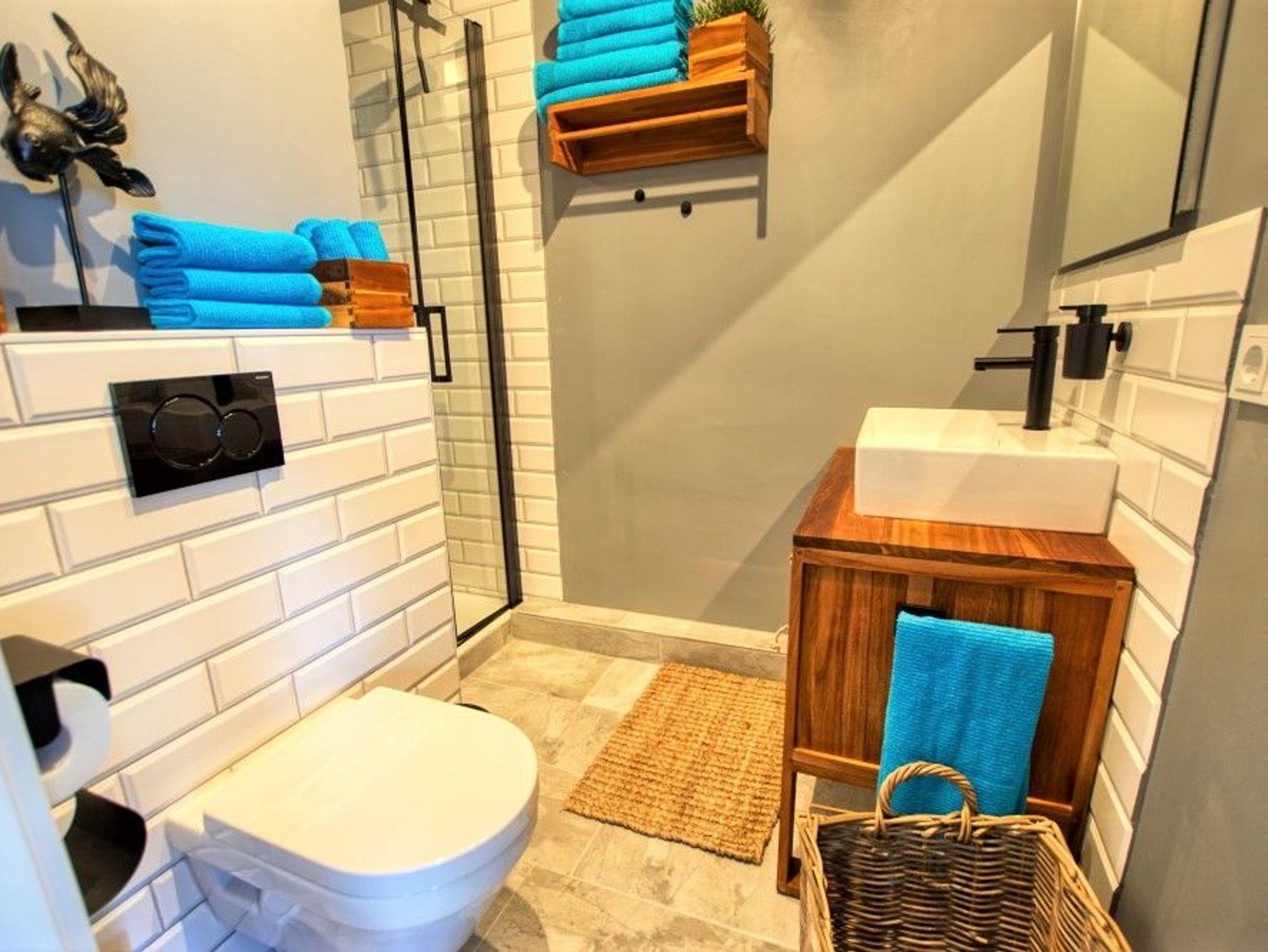 Badezimmer mit Duschkabine mit niedrigem Einstieg, Handtuchtrockner und WC