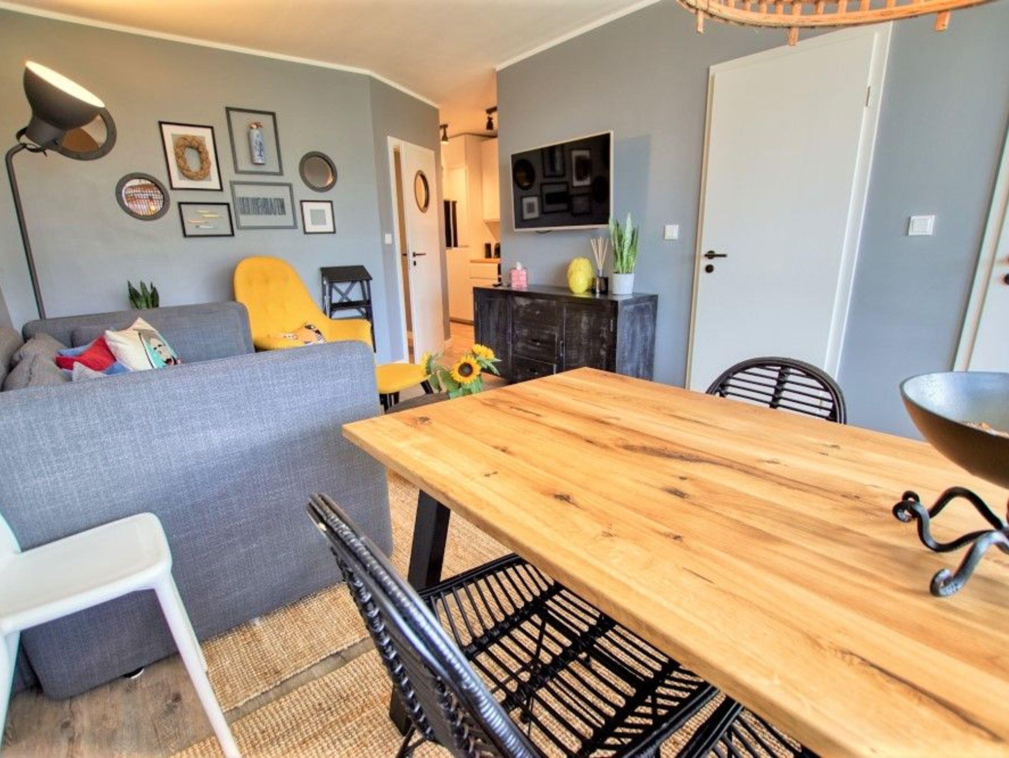 Wohnzimmer mit Schlafsofa (für 2 Personen), Smart-TV und Esstisch vor dem Balkon