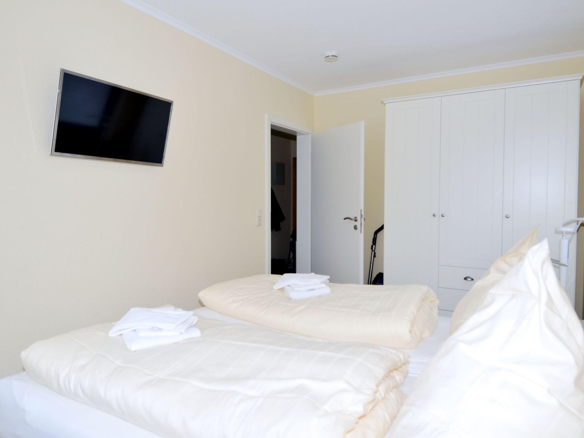 Das separate Schlafzimmer ist mit einem komfortablen Doppelbett, einem Kleiderschrank und einem TV ausgestattet. Das große Tageslicht-Bad verfügt über eine Waschmaschine, ein WC und eine ebenerdige Dusche.