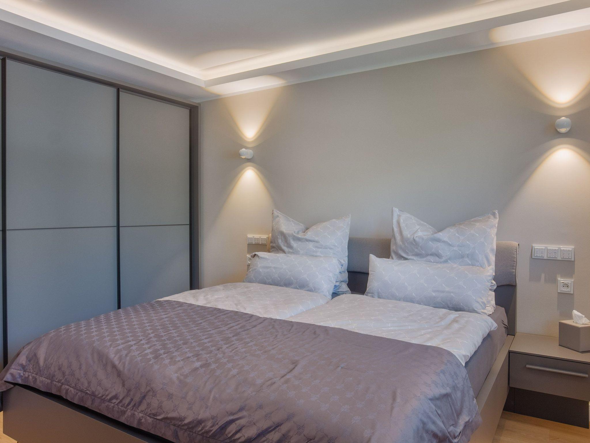 Die Ferienwohnung Seewind 2 verfügt im Schlafzimmer über ein bequemes, erhöhtes Doppelbett (180x200). Eine Entertainment-Ausstattung mit 4K-OLED-Smart-TV, SONOS-Soundambiente und Beleuchtungselementen gehört hier auch dazu. Ein großer Kleiderschrank und eine Kommode bieten viel Stauraum. Kofferständer, Bügeleisen/-brett, Erste-Hilfe-Set oder Safe sind für den Komfort vorhanden. Rollläden sorgen für Verdunklung.