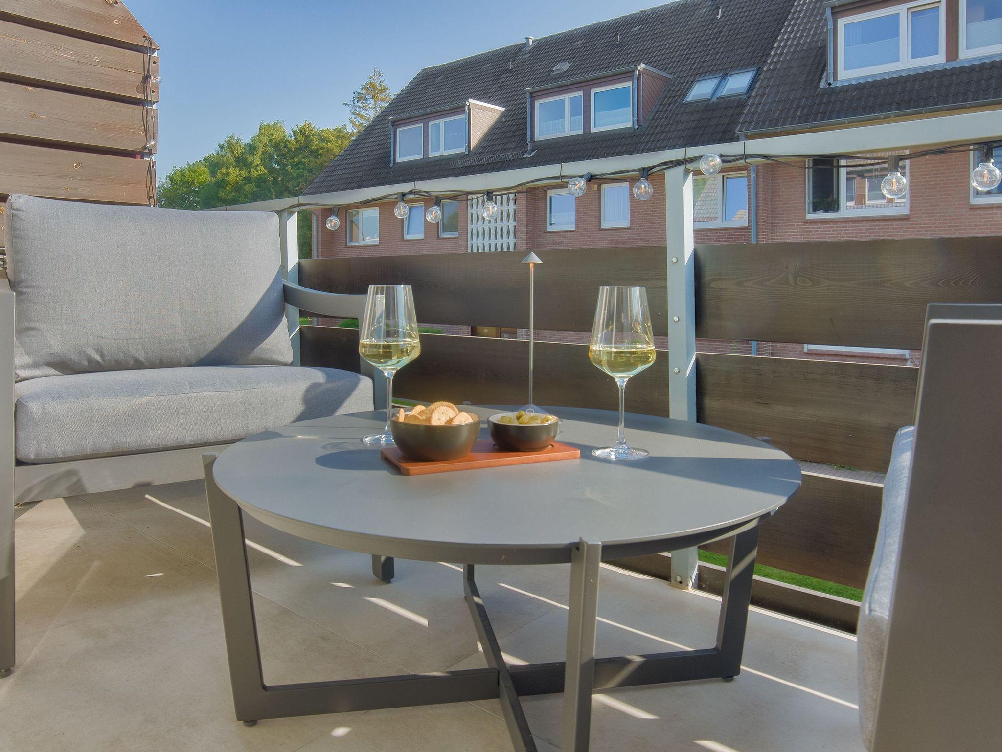 Der Balkon mit Loungemöbeln und Südausrichtung erlaubt unvergessliche Sonnenstunden. Elektrische Rollläden, Insektenschutz an der Balkontür oder automatisierter Beleuchtung...natürlich dabei. Dieser lädt dazu ein, den Tag mit einer Tasse Kaffee an der frischen Seeluft zu beginnen oder laue Sommerabende entspannt ausklingen zu lassen.