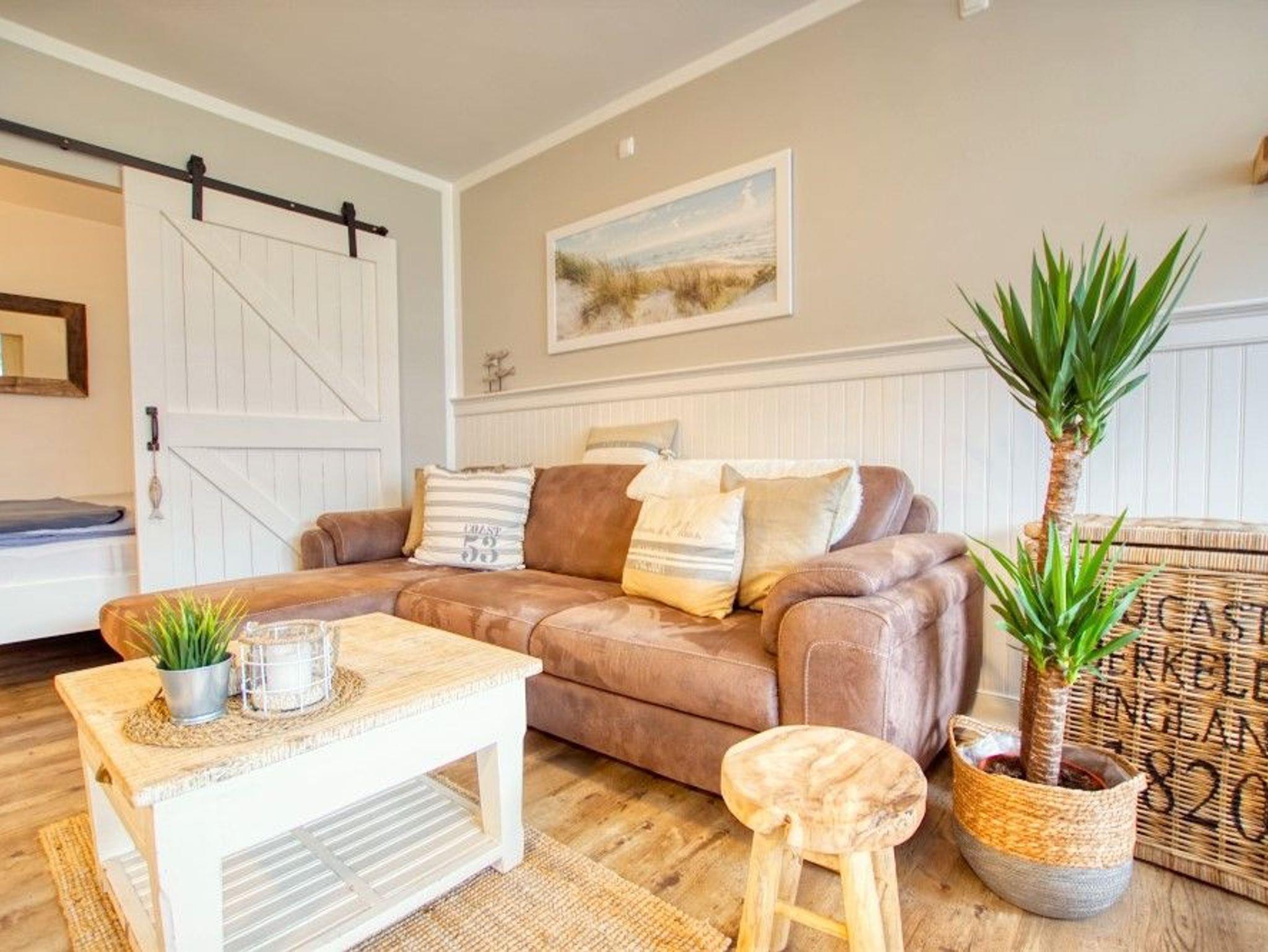 Offener Wohnbereich mit gemütlichem Ecksofa, Vinylboden und stilvoller Dekoration im Beachstyle