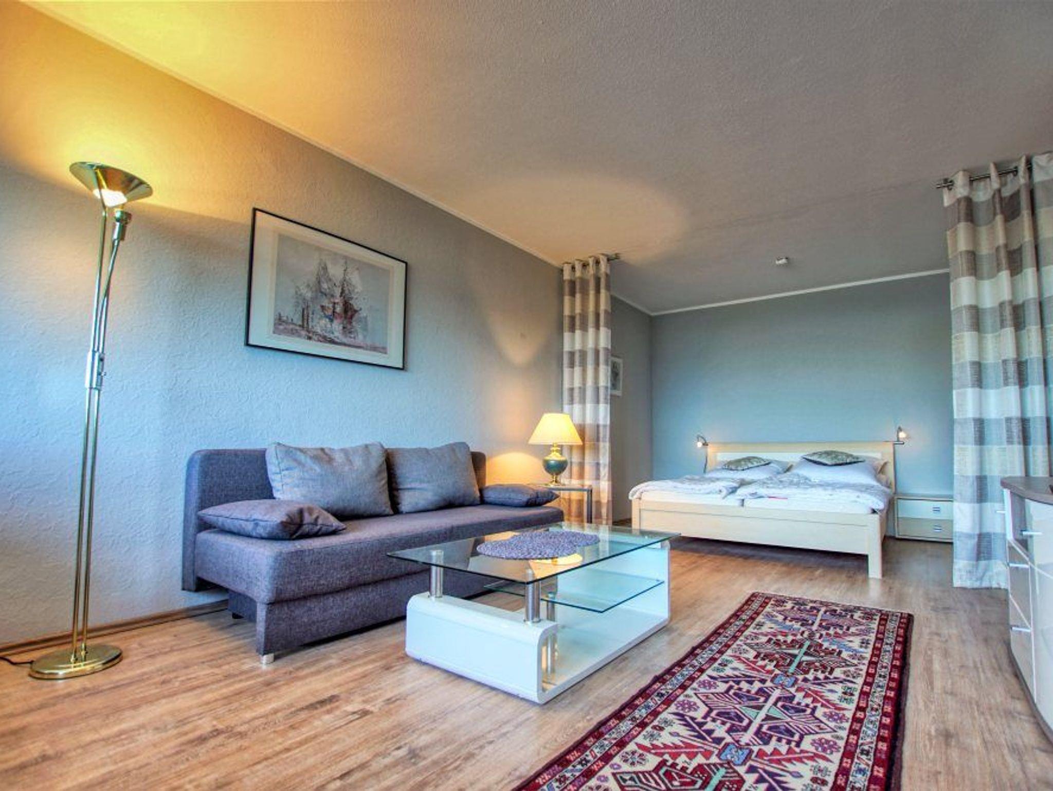 Wohn-Esszimmer mit Schlafsofa (130x190), Flachbildfernseher und Radio