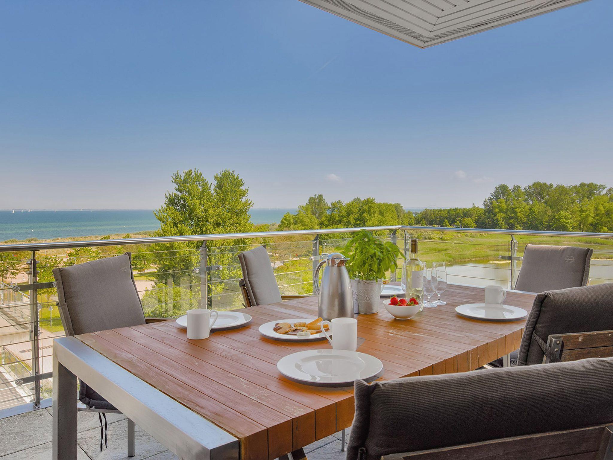 Der lichtdurchflutete Wohnbereich lädt mit zwei bequemen Couches, einem 3D-TV (inklusive Brillen), einer SONOS-Soundanlage und einem Blu-Ray-Player zum Entspannen ein. Die angrenzende, offene Designerküche ist voll ausgestattet und verfügt über ein Induktionskochfeld, hochwertige WMF-Küchenutensilien und zahlreiche Extras, um höchsten kulinarischen Ansprüchen gerecht zu werden. Der Essbereich bietet einen direkten Ostseeblick und schafft eine besondere Atmosphäre beim Speisen.