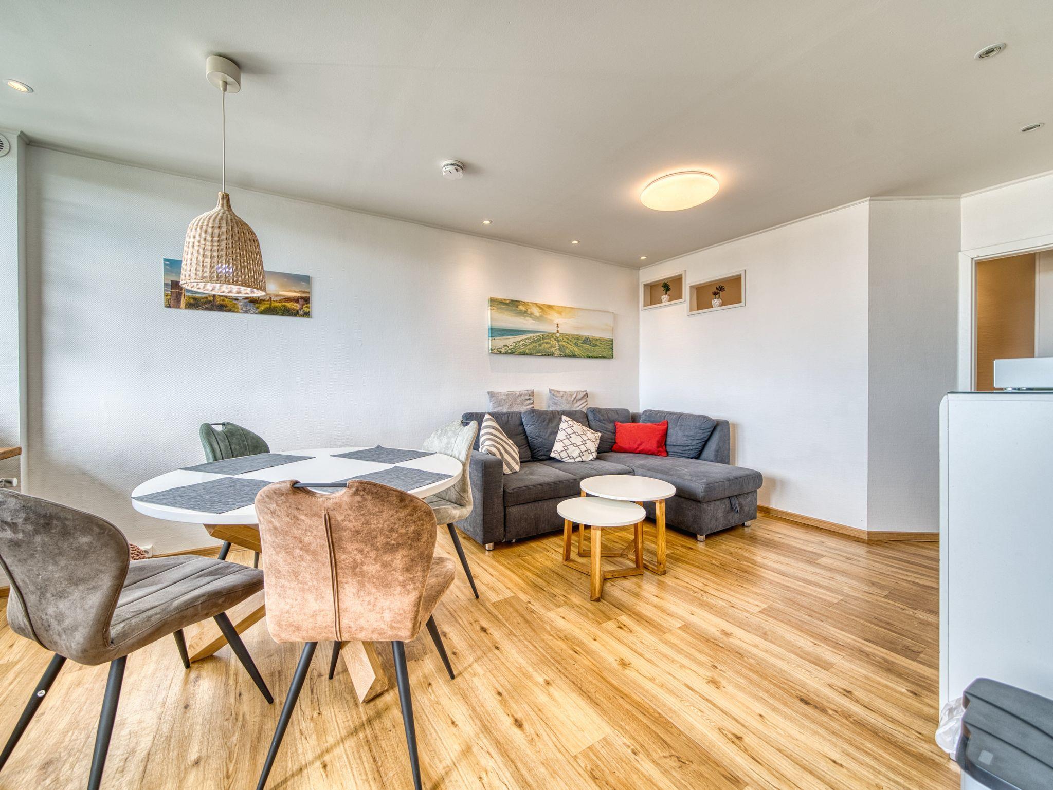 Heller Wohn- und Essbereich mit gemütlicher Eckcouch, Esstisch, Flachbild-TV, Musikanlage und CD-Player