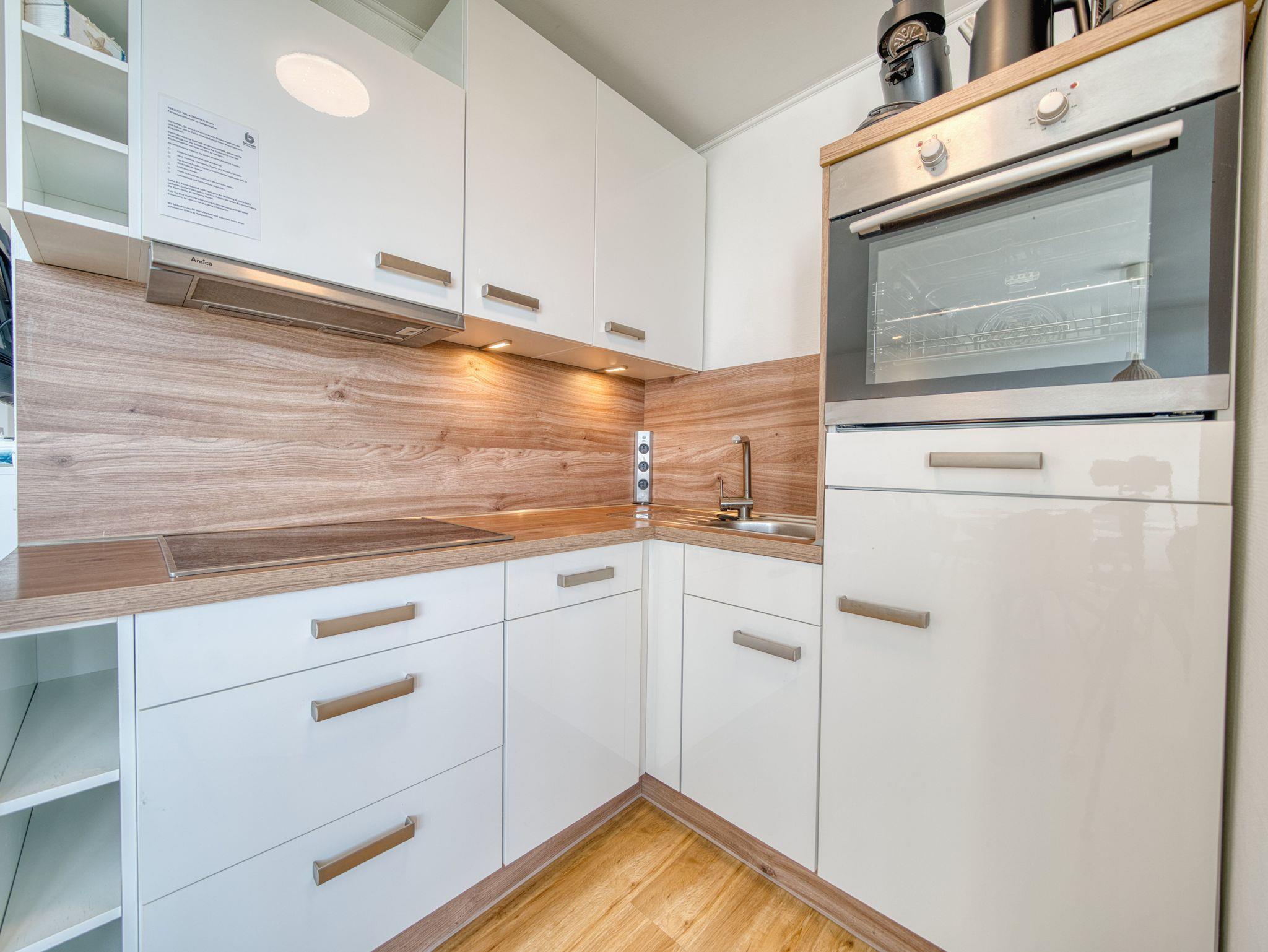 Voll ausgestattete Küche mit Geschirrspüler, Backofen, Ceranherd, Kühlschrank mit Gefrierfach