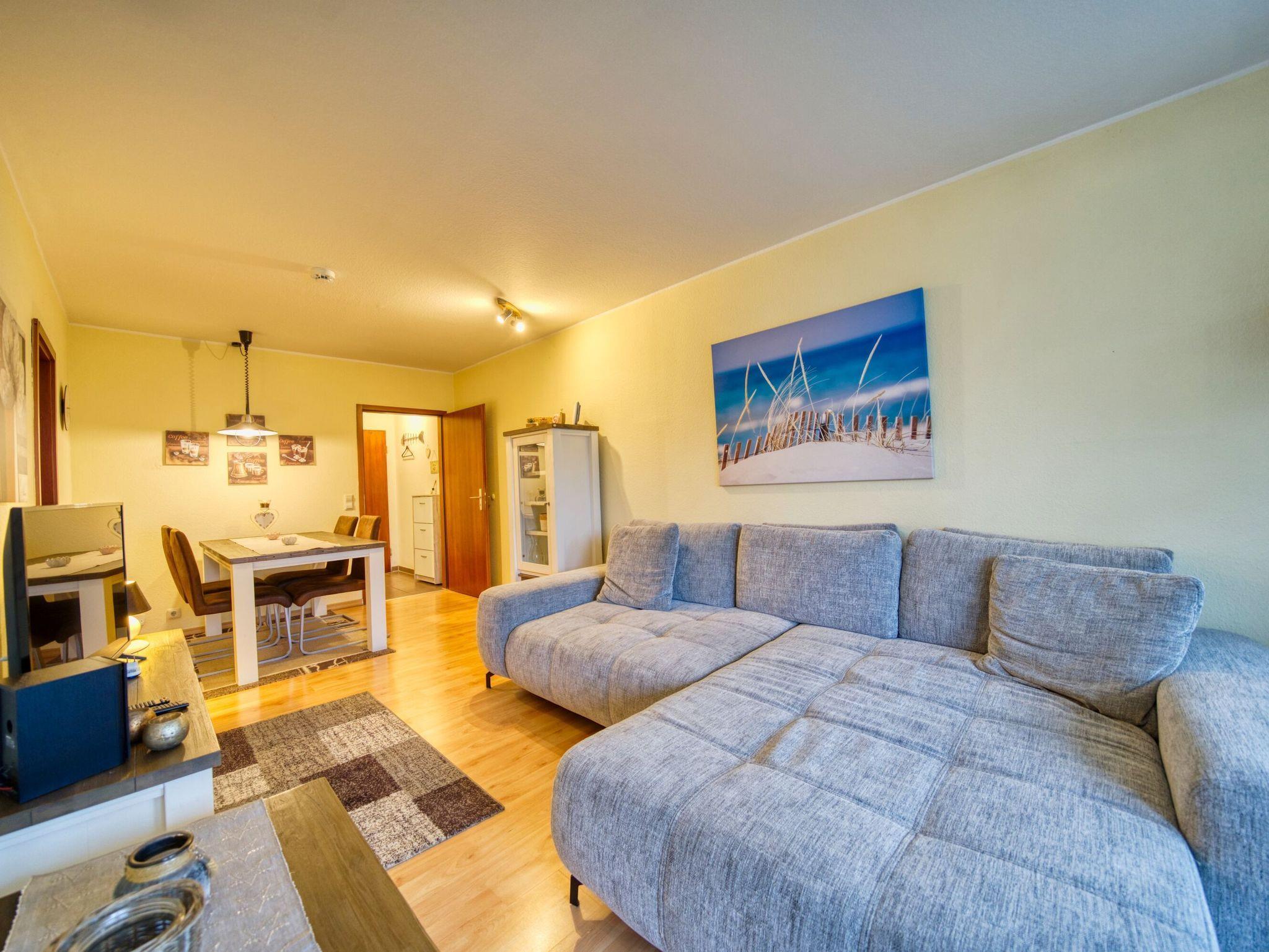 Wohn-Esszimmer mit gemütlicher Sofaecke, Esstisch und Zugang zum Balkon