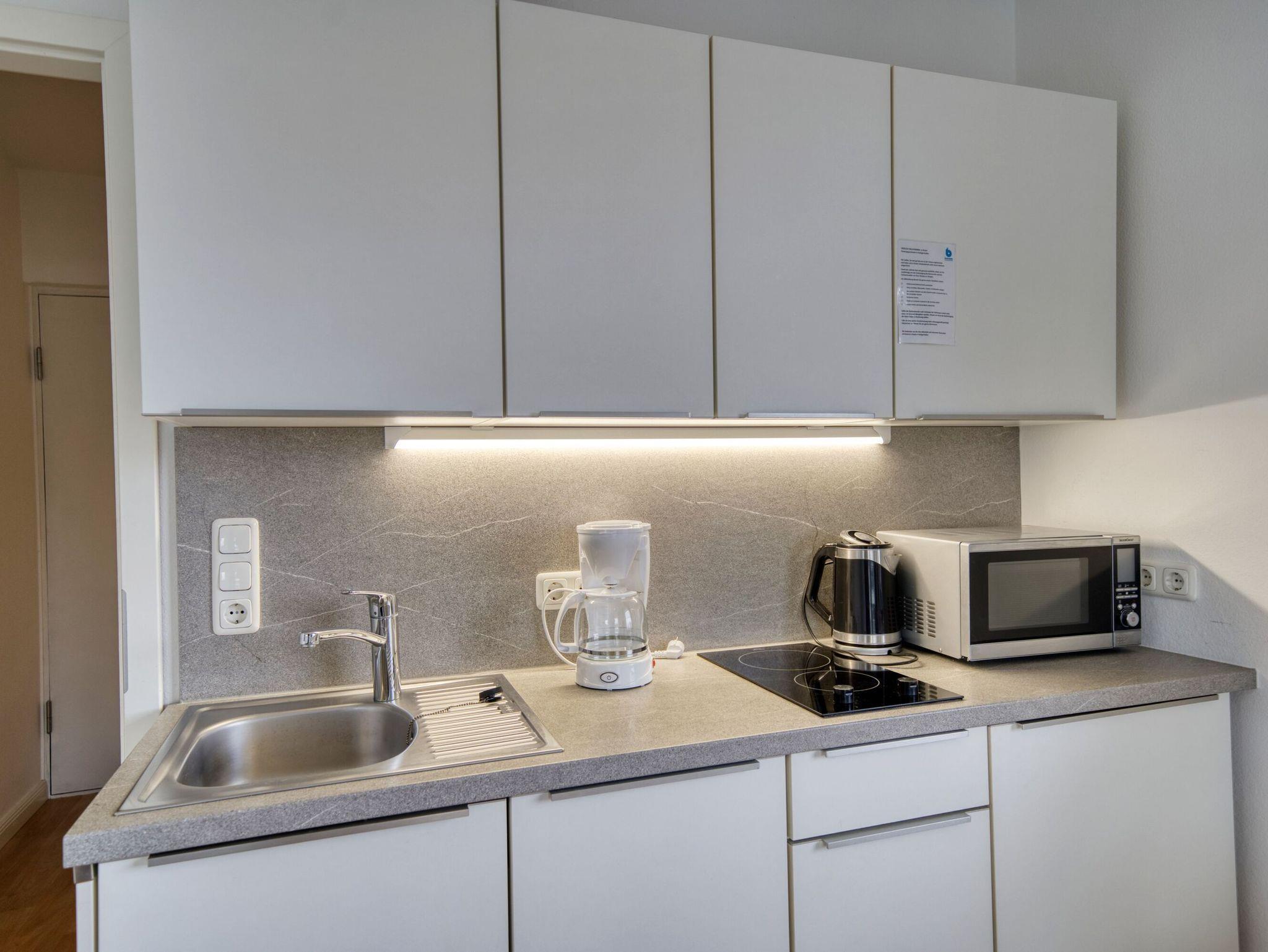 Küche: Geschirrspüler, Kühlschrank mit Gefrierfach, Toaster, Mikrowelle, 2-Plattenherd, Filterkaffeemaschine, Wasserkocher