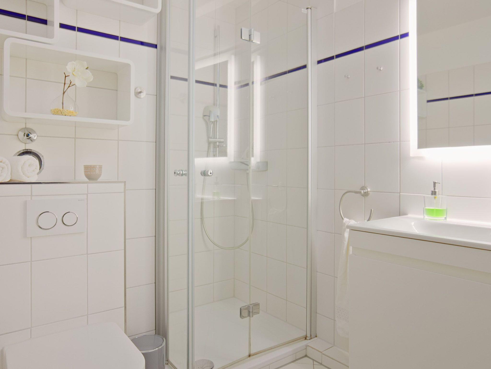 Das hochwertige, moderne Badezimmer ist mit einer geräumigen Dusche, einem beleuchteten Spiegel, einem Handtuchwärmer und einem Föhn ausgestattet perfekt für einen angenehmen Start in den Tag.