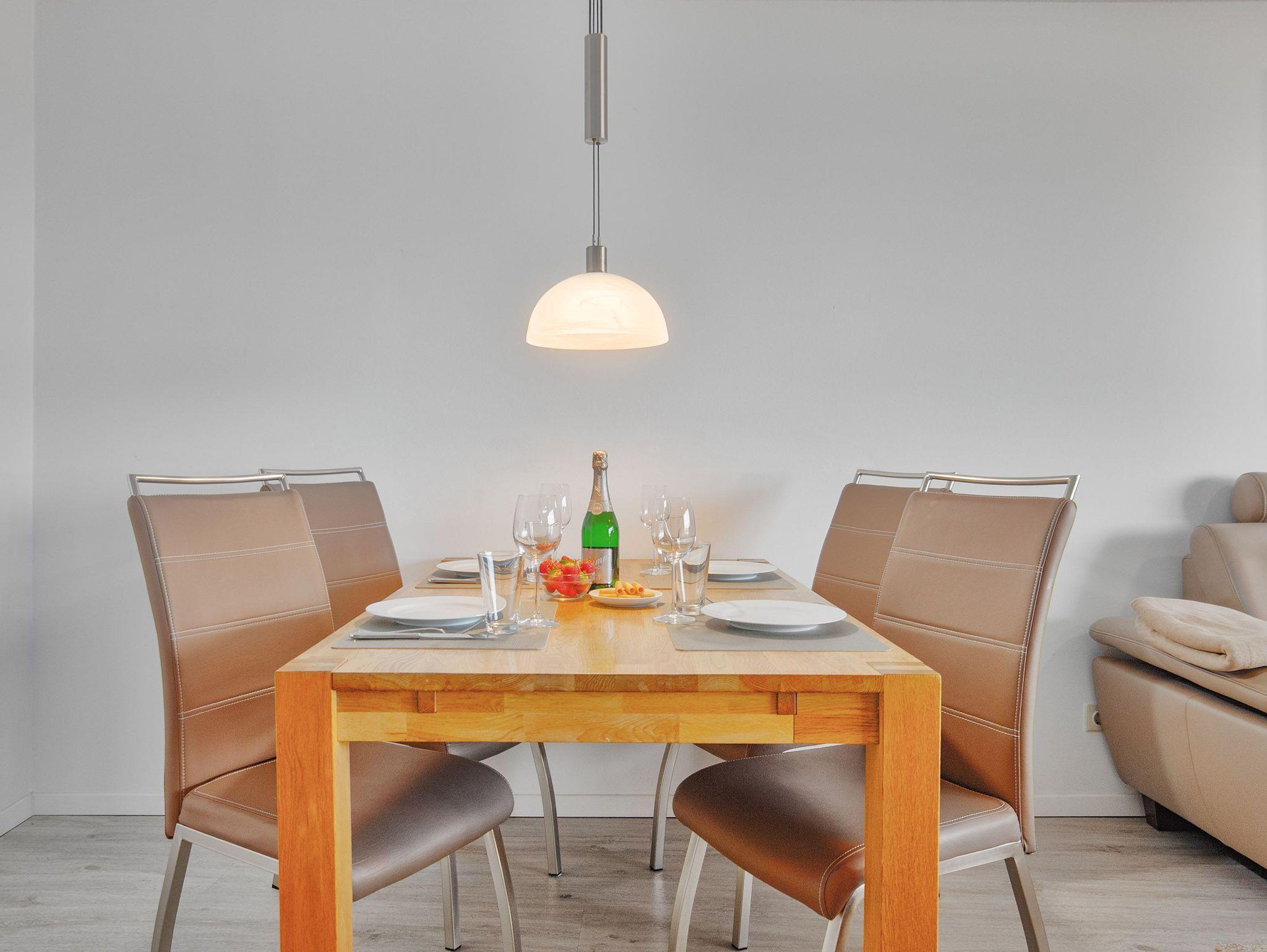 Die moderne und offene Küche mit Vollausstattung lässt keine Wünsche offen. Komfortabel steht dort zudem ein Bistrotisch mit Barhockern für den kleinen Snack zur Verfügung.