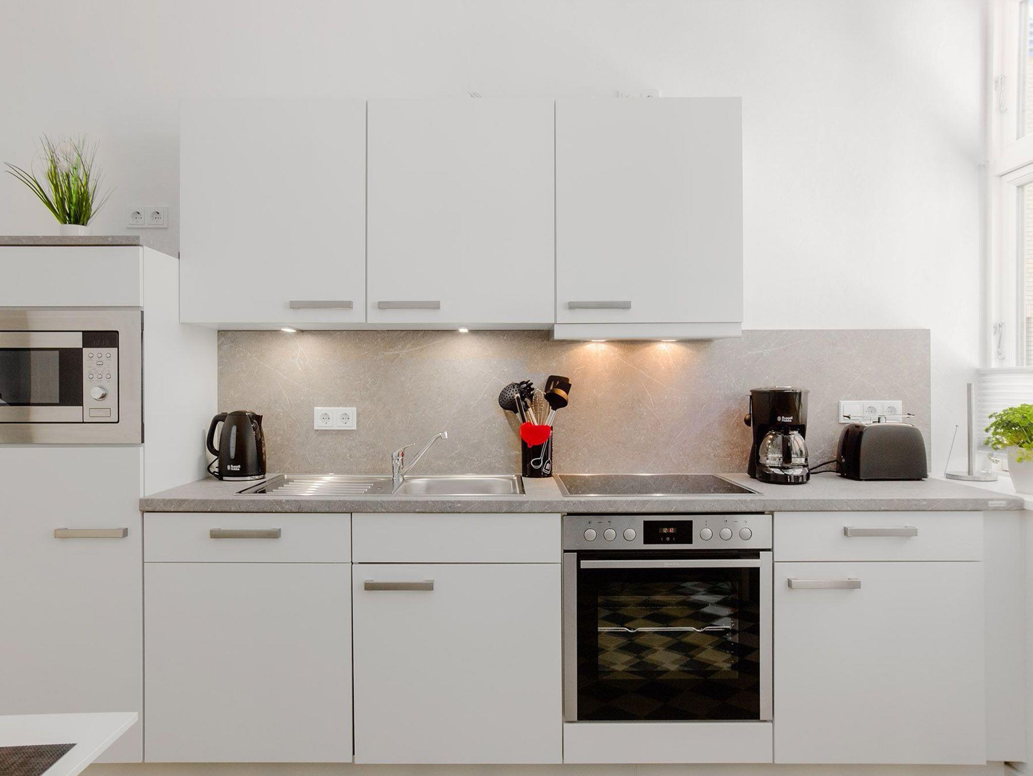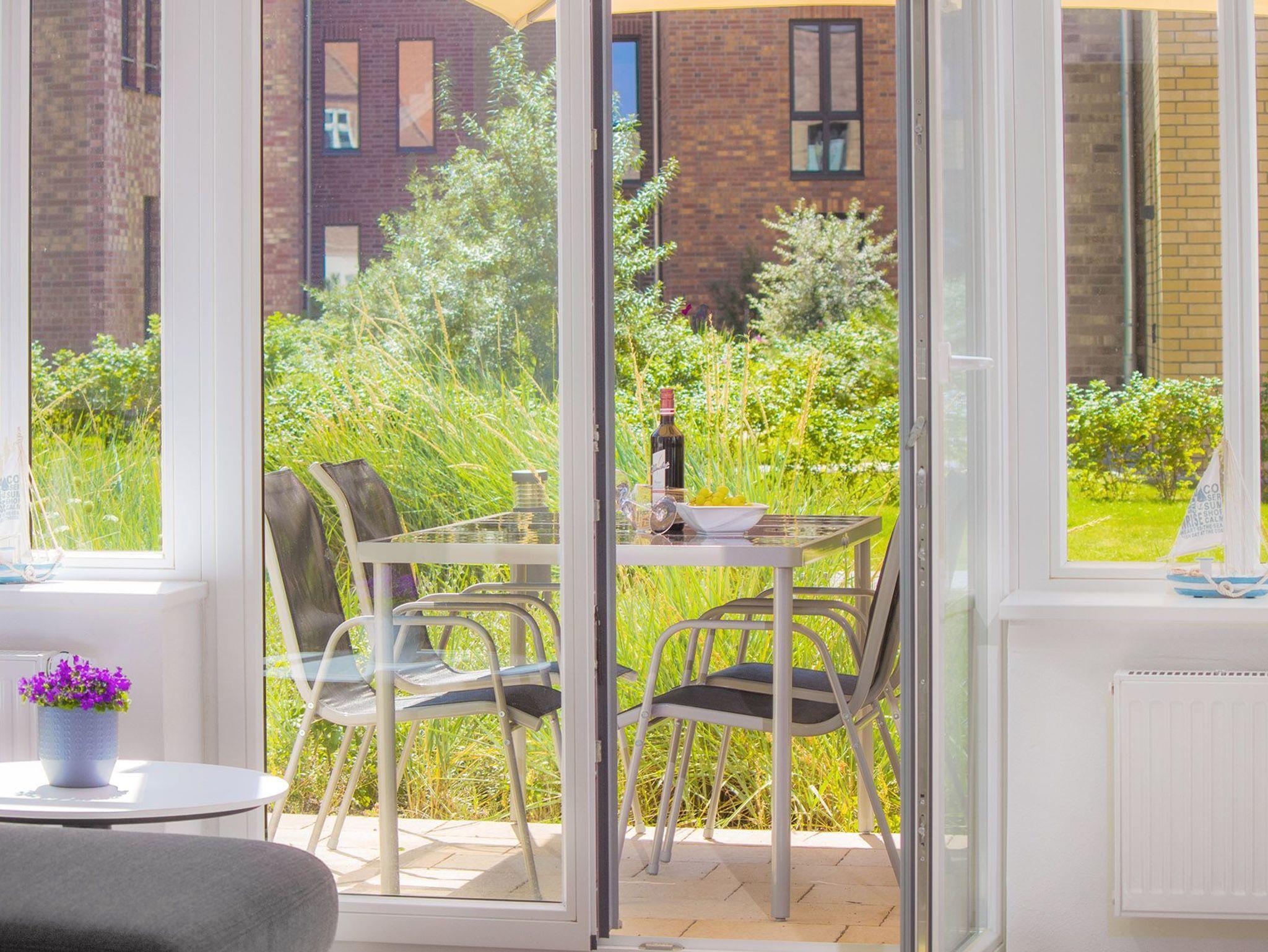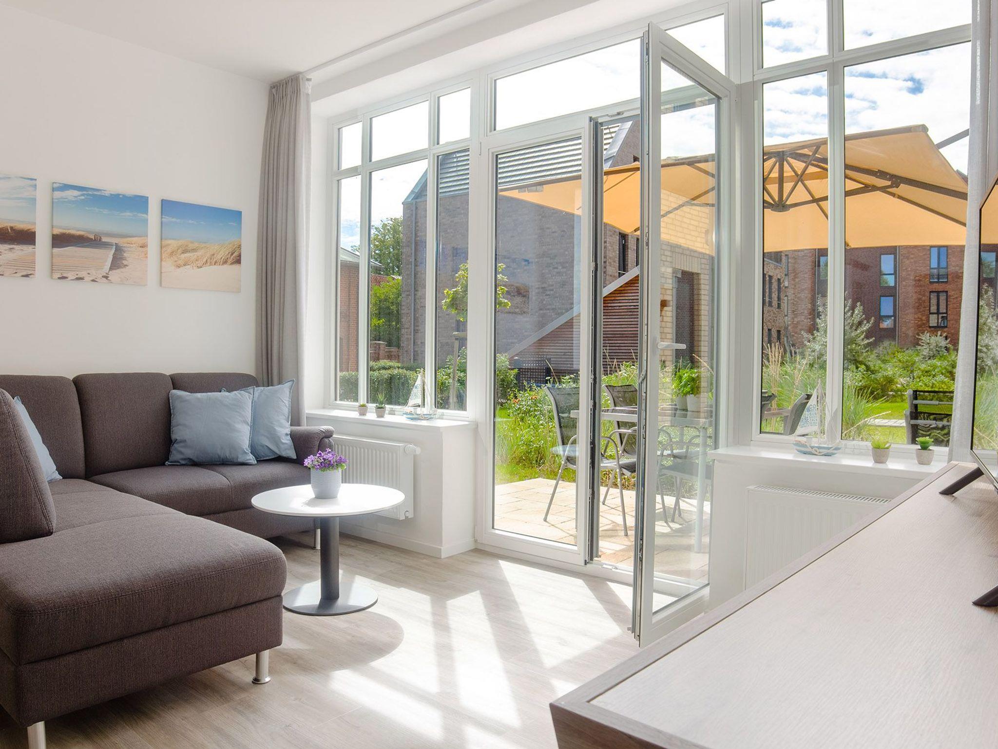 Der geschmackvolle Wohnbereich ist offen gestaltet und mit einer gemütlichen Couch, Smart-TV und WLAN ausgestattet ? perfekt für entspannte Stunden mit Streaming-Möglichkeiten. Große Fenster bringen viel Tageslicht in die Wohnung und ermöglichen einen direkten Blick ins Fischerdorf Heiligenhafen.