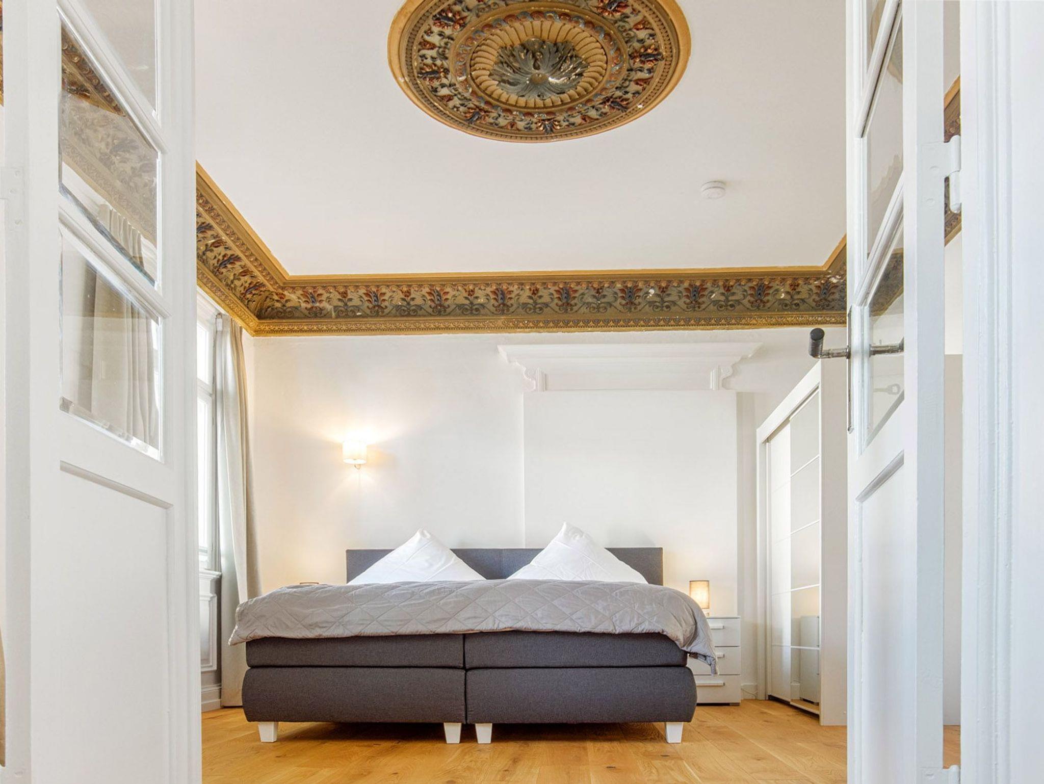 Die Ferienwohnung ist besonders für Familien geeignet, da sie über zwei Schlafzimmer verfügt. Das erste Schlafzimmer ist mit einem Doppelboxspringbett (180x200) ausgestattet und beeindruckt mit historischem Stuckdekor und einem Kamin (nicht nutzbar). Dieses Zimmer dient als Durchgangszimmer zum zweiten Schlafzimmer, das über ein Etagenbett (je 90x200) verfügt. Blickdichte Plissees und Vorhänge sorgen für eine angenehme Verdunkelung und eine erholsame Nachtruhe. Allergiker-geeignete Bettwäsche, Handtuchsets, ein Babyreisebett (ohne Bettzeug) und ein Hochstuhl können gegen Gebühr hinzugebucht werden.