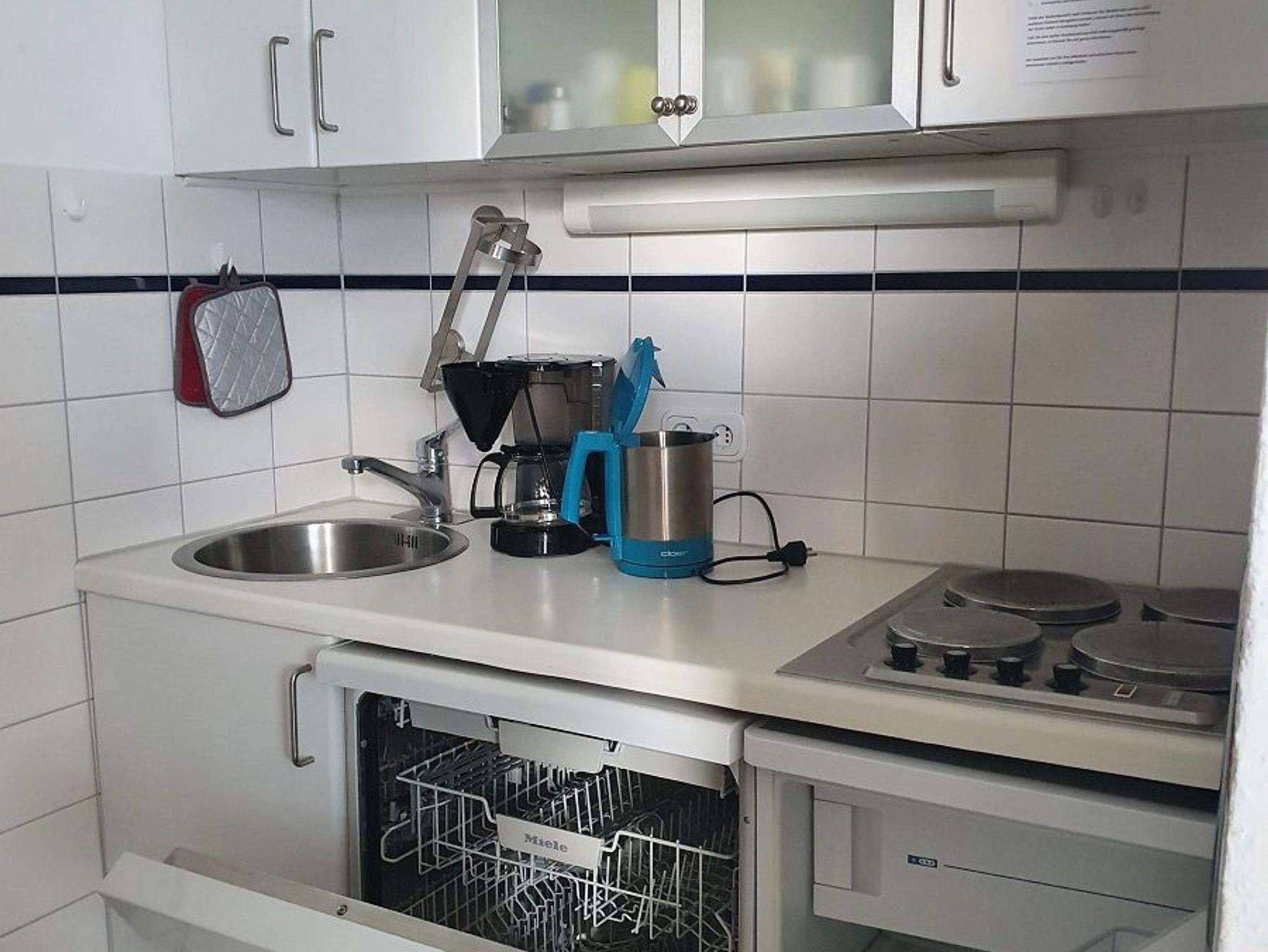 Küche: Mikrowelle, Geschirrspüler, Kühlschrank mit Gefrierfach, Herd mit 4 Kochplatten, Filterkaffeemaschine