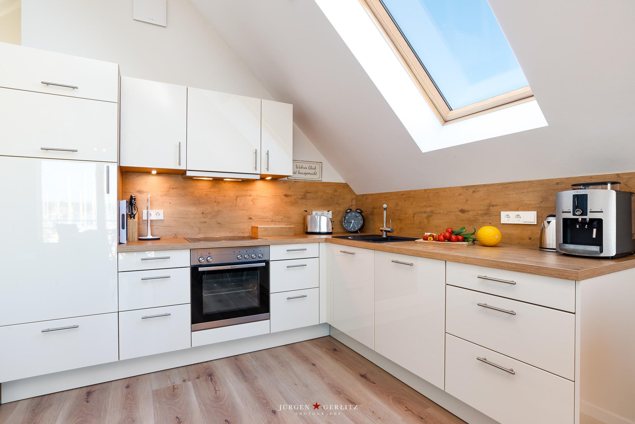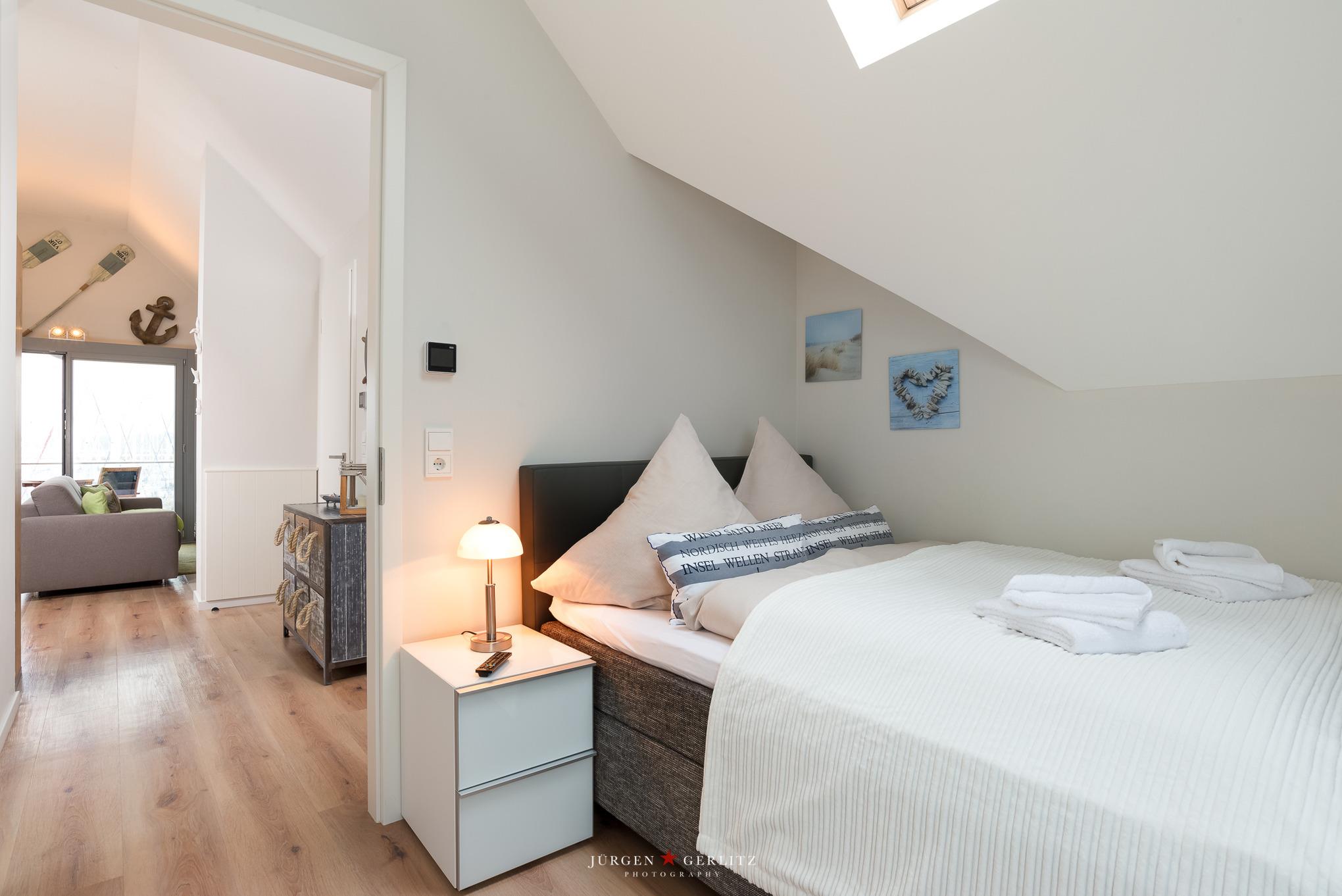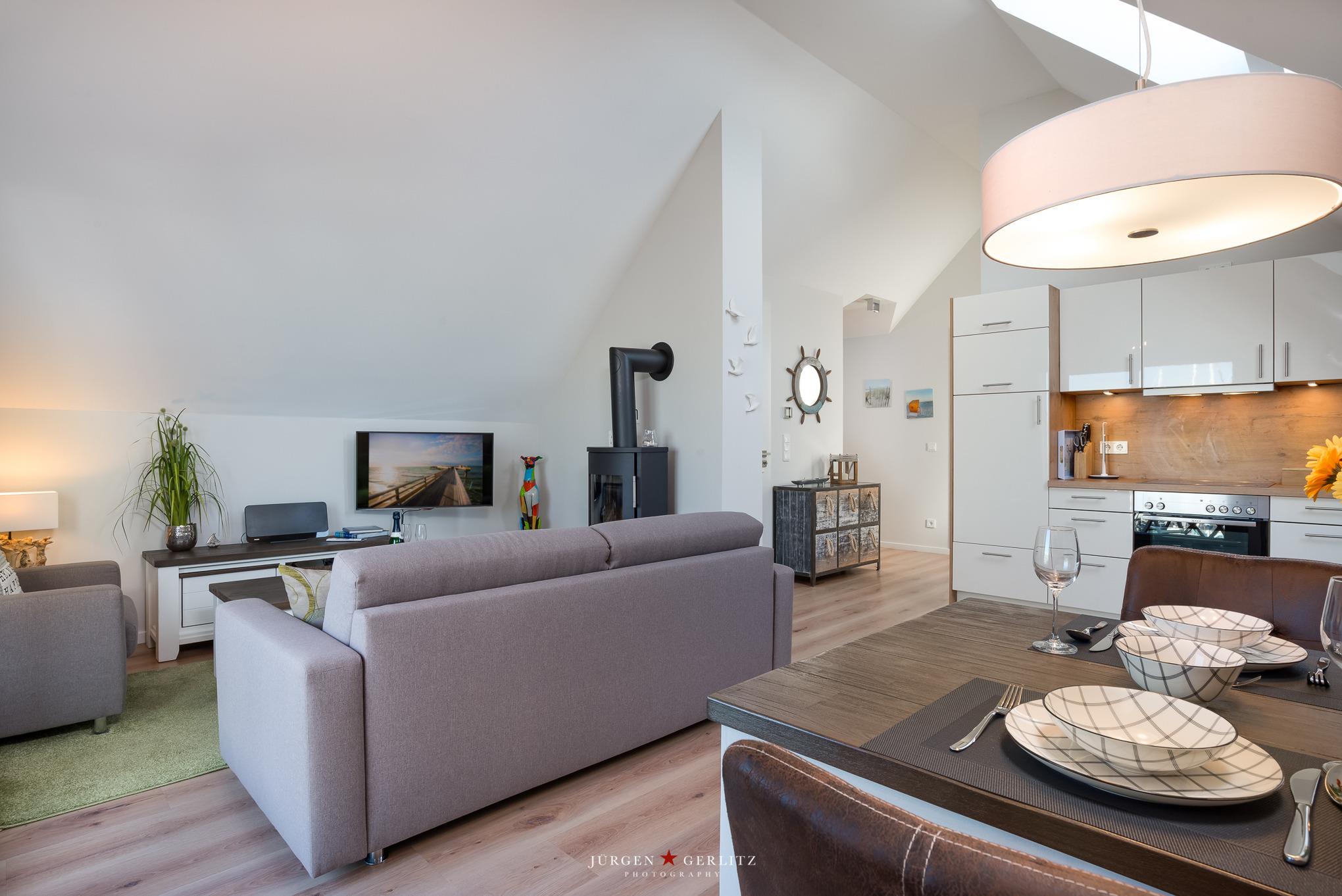 Bei der modern und hochwertig eingerichteten Ferienwohnung handelt es sich um eine helle 2 ½-Zimmer-Dachgeschoßwohnung für 2 – 4 Personen mit 2 Balkonen. Die knapp 70 m² Grundfläche bzw. 63 m² Wohnfläche besteht aus Wohnzimmer, Schlafzimmer, einem kleinen Schlafzimmer und einem komfortablen Bad.