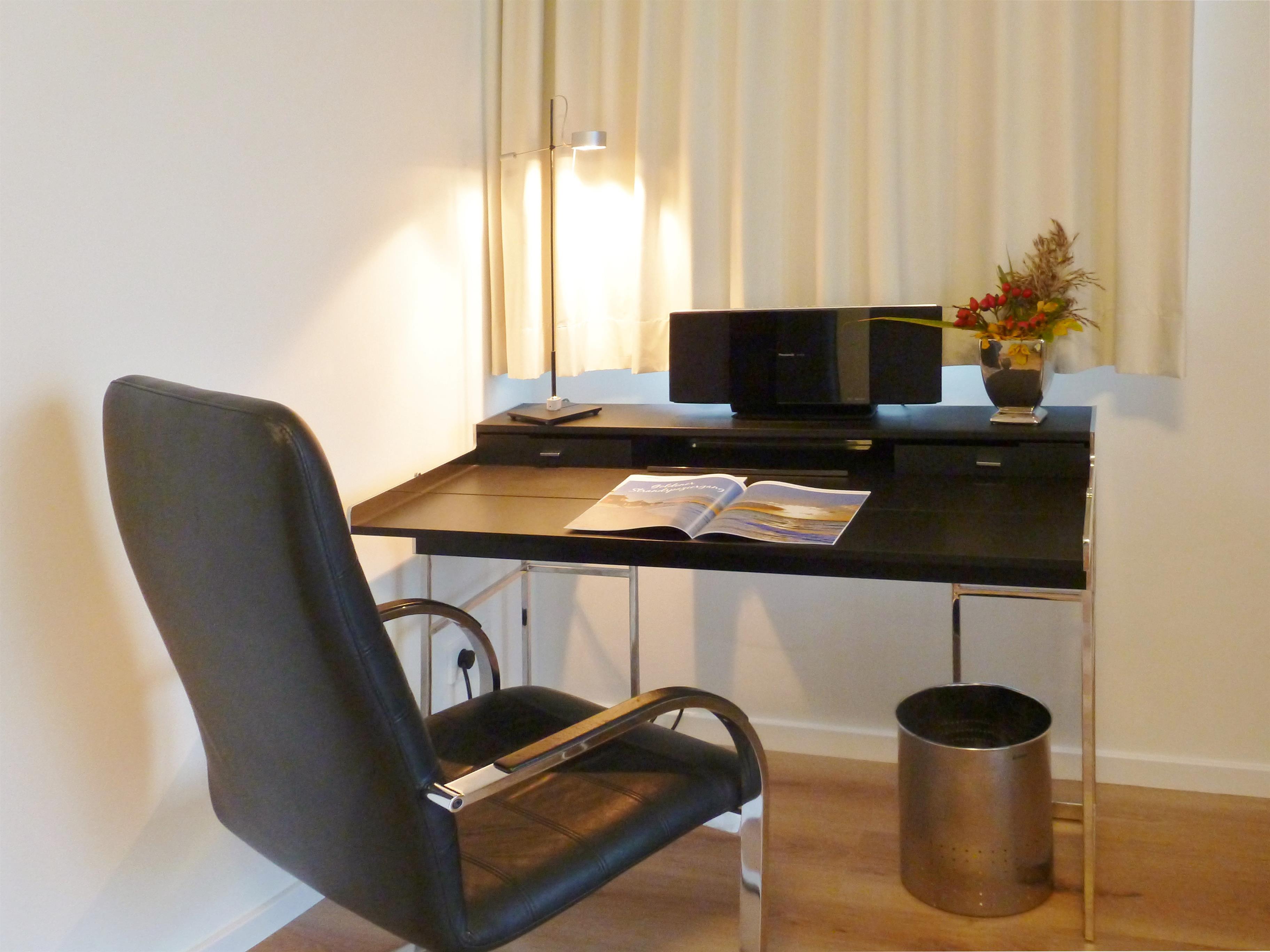Ein über 20 qm großes Schlafzimmer ist mit einem eleganten Schreibtisch ausgestattet und enthält eine Sitzecke. Rücken Sie den Sessel auf den Balkon und genießen Sie den phantastischen Blick über den Yachthafen, den Graswarder und die Fehmarnsundbrücke.