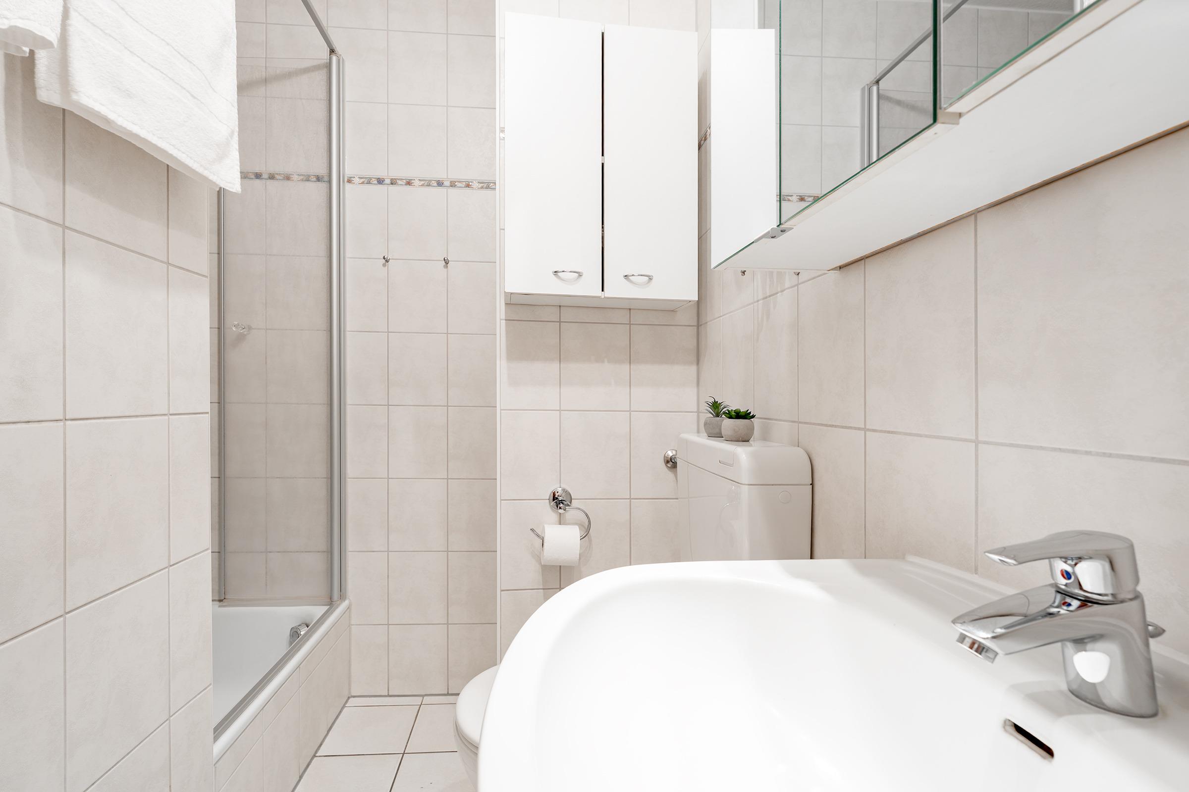 Der Wohnbereich empfängt Sie mit einer komfortablen Sitzgarnitur, TV und Radio – ideal zum Ausspannen. Vom Wohnraum gelangen Sie direkt auf den sonnigen Südbalkon – perfekt für laue Abende. Die moderne Küchenzeile ist komplett ausgestattet mit Cerankochfeld (2 Felder), Backofen, Geschirrspüler, Mikrowelle, Kühl- und Gefrierschrank, Kaffeemaschine, Toaster und Wasserkocher. Der Essbereich lädt zu gemeinsamen Mahlzeiten ein. Im Schlafzimmer finden Sie ein Doppelbett und TV, im zweiten Raum sorgt ein Etagenbett für familienfreundliche Schlafmöglichkeiten. Das Bad ist mit einer Dusche (38 cm Einstieg) und WC ausgestattet.