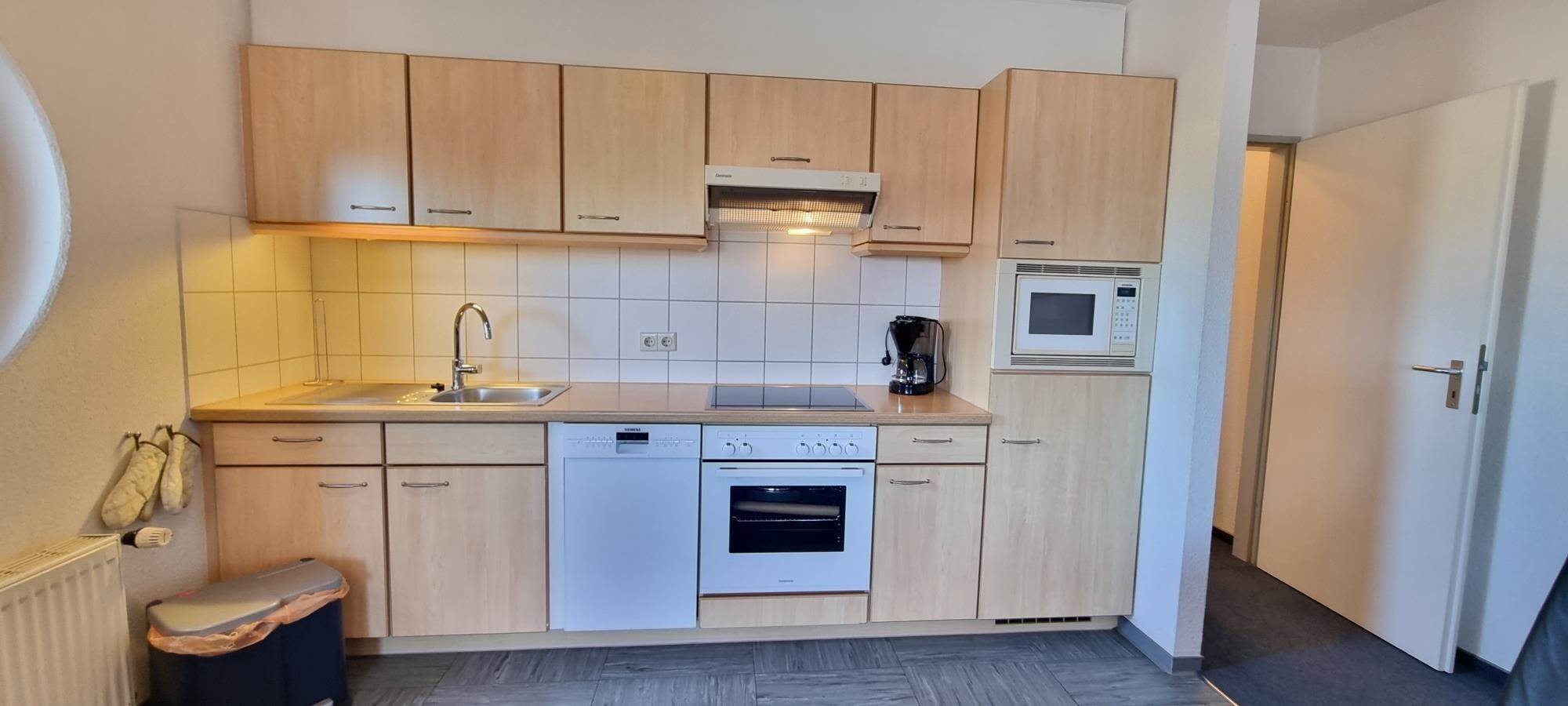 Voll ausgestattete Küchenzeile mit Elektroherd (Ceranfeld), Backofen, Kühlschrank, Kaffeemaschine, Wasserkocher und Toaster – ideal für Ihre Selbstverpflegung.
