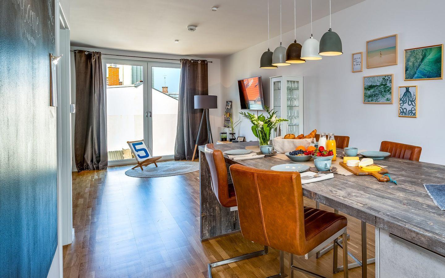Hafennahe Maisonette-Ferienwohnung für 5 Personen mit möblierten Balkonen und offenem Wohn-, Ess- & Küchenbereich -850m zum Strand