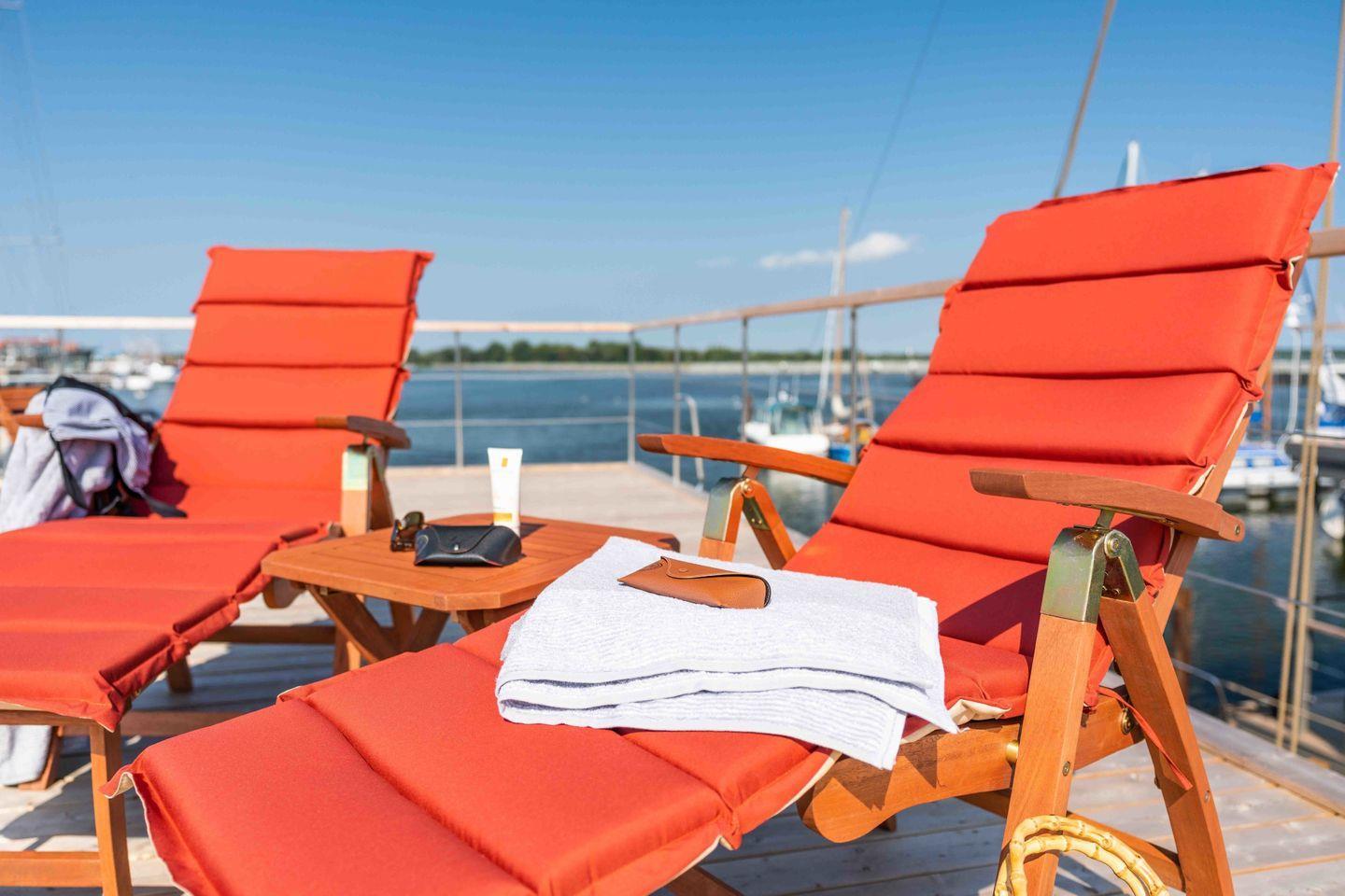 Das großzügige Sonnendeck erstreckt sich über die gesamte obere Etage und bietet einen Rundumblick über den Hafen und Bodden. Liegen, Deckchairs und Strandkorb laden zum Entspannen, zu Sundowner & Co ein.