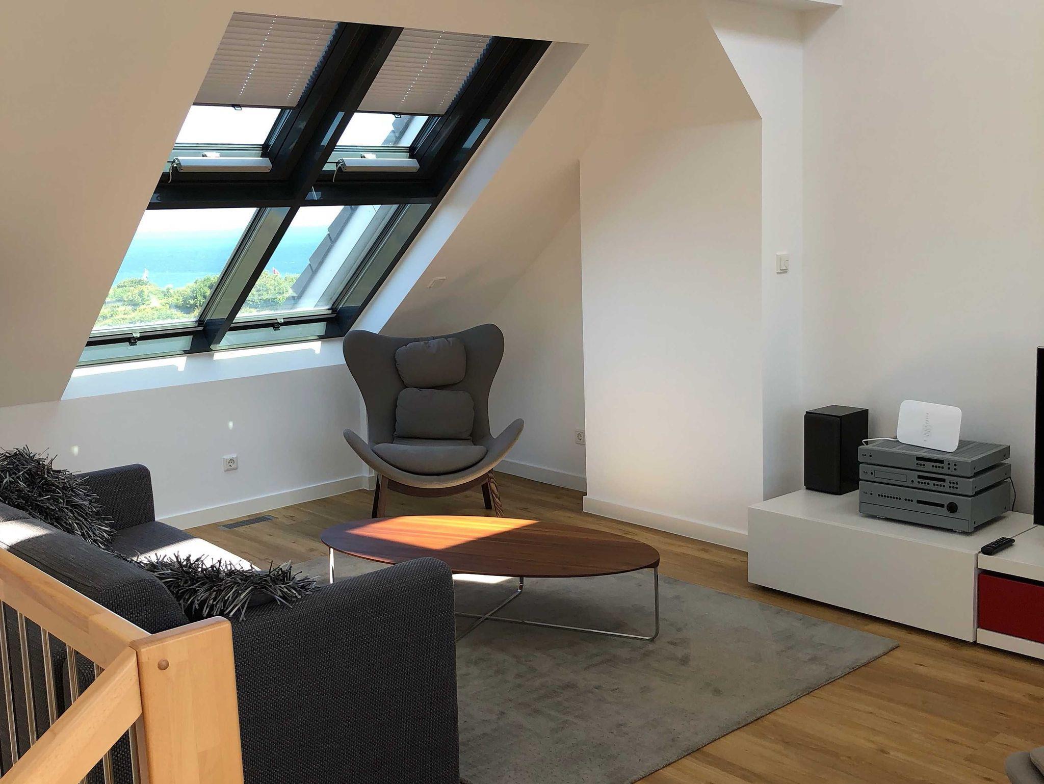 Die luxuriöse Maisonette Wohnung hat ca. 70 qm Wohnfläche und verfügt in der unteren Etage über eine komplett ausgestattete Küche mit Geschirrspüler und Zugang zum Balkon, einen großzügigen Essbereich und Blick auf das Meer und ins Grüne. Bad mit Dusche und WC, Schlafzimmer mit einem komfortablen Doppelbett. Im Studio in der oberen Ebene befindet sich ein Wohn/Schlafbereich mit Blick auf die Nordsee durch das Panoramadachfenster und Zugang zur Dachterrasse mit Blick auf den Leuchtturm und die Düne. WLAN, TV und Radio/Dockingstation stehen zur Verfügung. Bettwäsche und Handtücher sind inklusive und werden bei längeren Aufenthalten gewechselt.