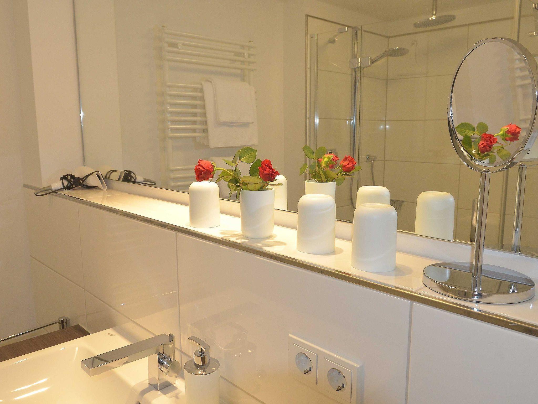 Die luxuriöse Wohnung hat ca. 55 qm Wohnfläche und befindet sich im Erdgeschoss. Der Wohnbereich mit offener, komplett ausgestatteter Küche und Essplatz hat einen Zugang zur Terrasse und einen unverbauten Blick auf die Nordsee und das grüne Oberland. Eine zweite Terrasse befindet sich auf der südlichen Sonnen-Seite der Wohnung.