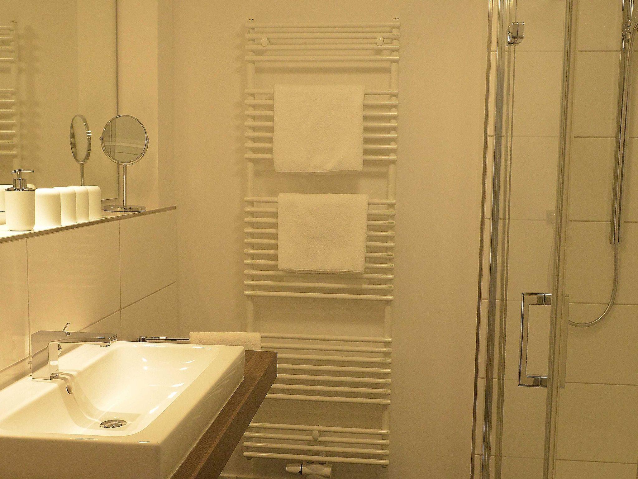WLAN, TV und Radio/Docking-Station stehen zur Verfügung, Bettwäsche und Handtücher sind inklusive und werden bei längeren Aufenthalten gewechselt. Es stehen Waschmaschinen und Trockner gegen Gebühr (Münzgeräte) im Untergeschoss zur Verfügung.