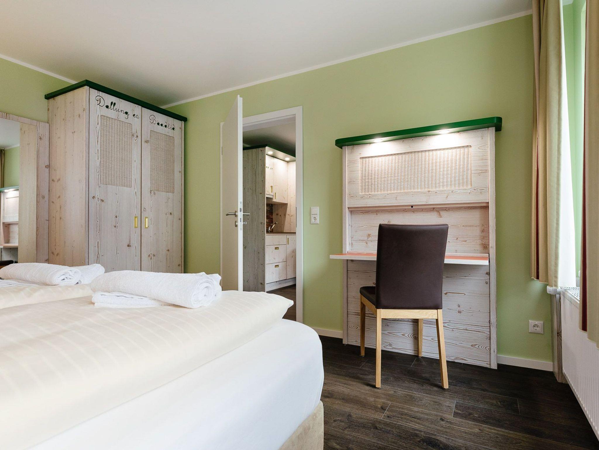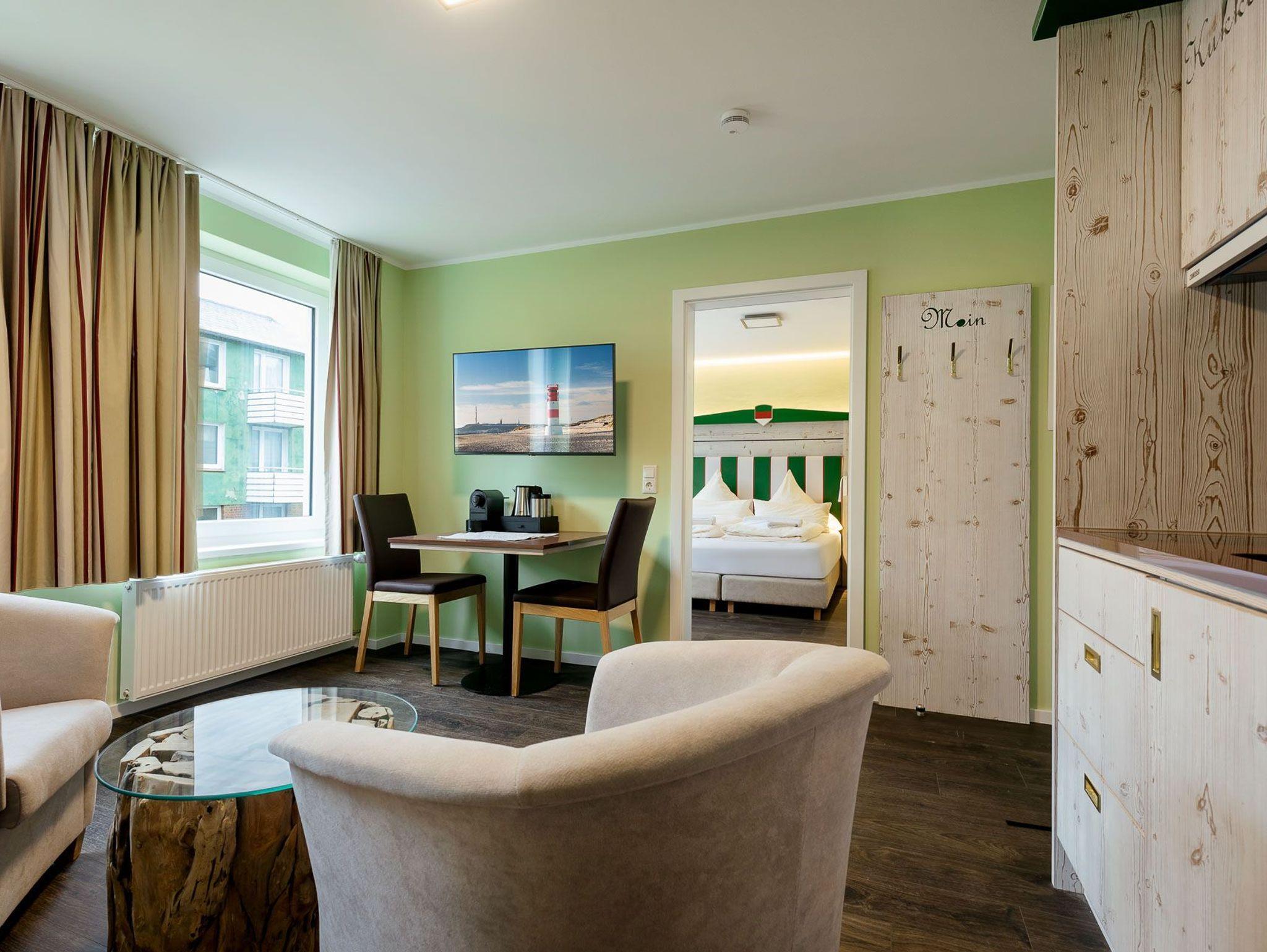 Sie wohnen im Haus Insulaner Ferienwohnungen in einer schön ausgestatteten, modernen Ferienwohnung zur Inselseite. Die Wohnung besteht aus einem Wohnbereich mit Küche, einem Schlafzimmer und einem Badezimmer mit Dusche.