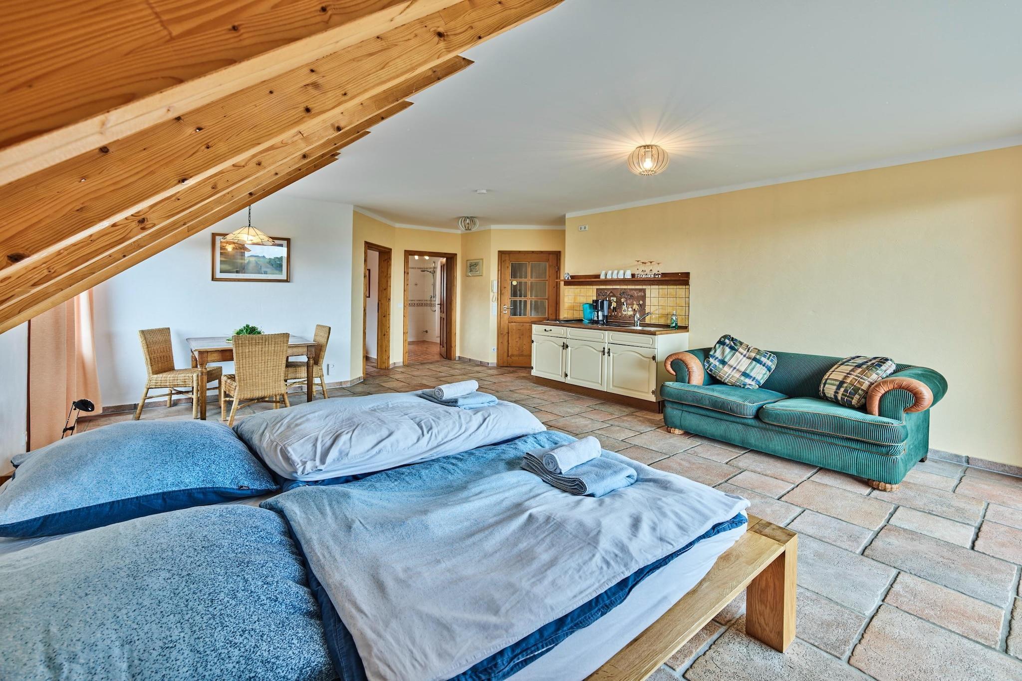 Underhållning & Wellness Detta rymliga semesterhus i Hellenthal rymmer upp till 12 gäster och erbjuder en perfekt blandning av avkoppling och nöje. Njut av filmkvällar med en DVD-, Blu-ray- och CD-spelare, eller varva ner i bubbelbadet och den infraröda bastun efter att ha utforskat de natursköna omgivningarna. Det mysiga vardagsrummet med öppen spis och gott om sittplatser sätter tonen för minnesvärda kvällar, medan vinterträdgården inbjuder till trevliga spel med biljard och festkul. Komfort och utrymme Det välutrustade köket har allt från en diskmaskin till en mikrovågsugn, vilket gör det enkelt att laga mat. Sovrummen är utspridda över första våningen, källaren och vinden, vilket garanterar avskildhet och komfort för alla. Ett mångsidigt vardagsrum/sovrum, flera badrum och genomtänkta detaljer som centralvärme och privat parkering gör den idealisk för familjer och grupper. Läge & äventyr Bara 9 km från centrum och 11 km från en sjö, är denna tillflyktsort perfekt för naturälskare och äventyrare. Oavsett om du vandrar, cyklar eller bara kopplar av i den privata trädgården eller på terrassen, erbjuder detta hem en lyxig bas för en oförglömlig semester.