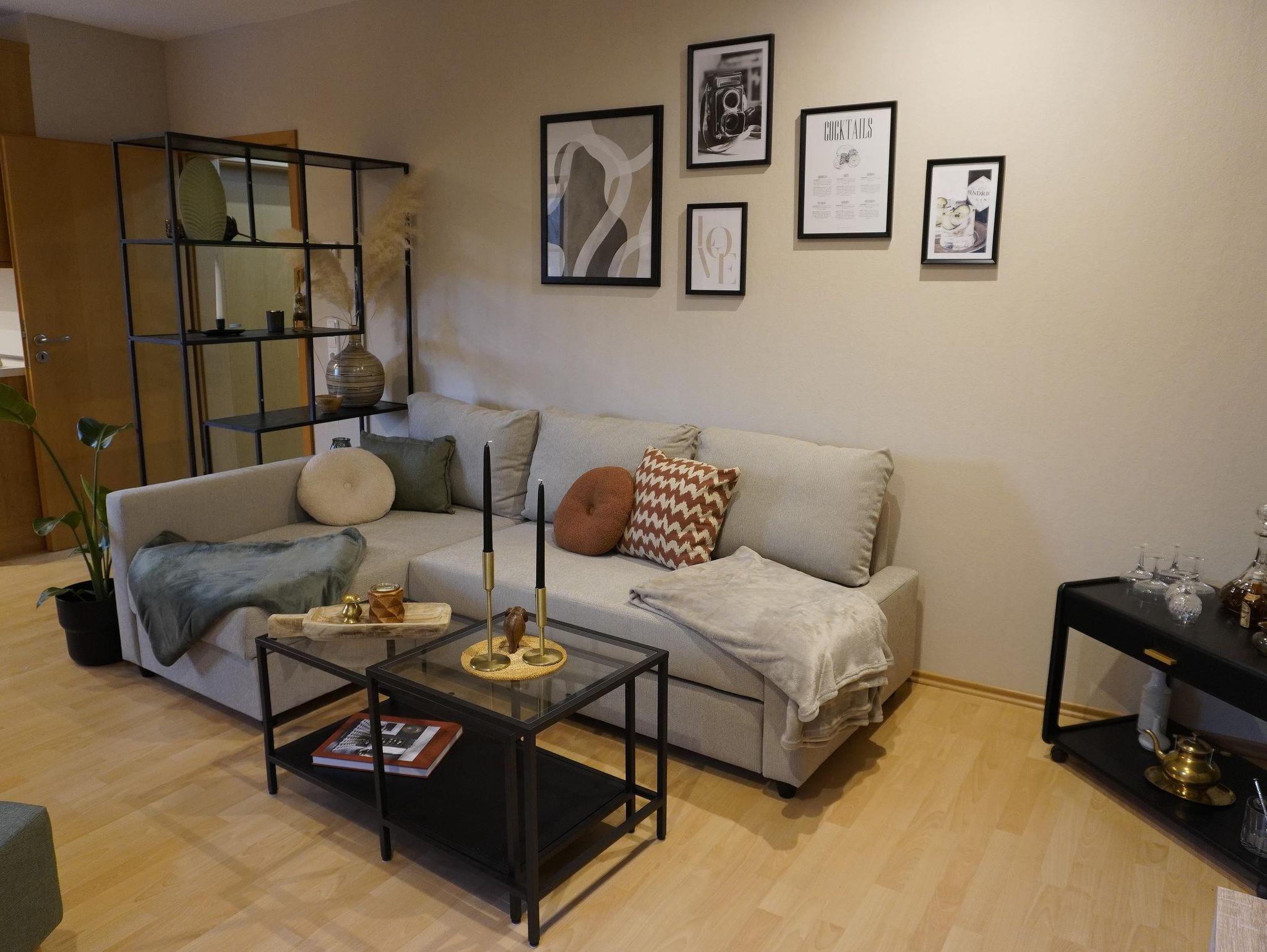 Die Ferienwohnung ist stilvoll und komfortabel eingerichtet und verfügt über ein geräumiges Wohnzimmer mit einer bequemen Couch und einem Flachbildfernseher.