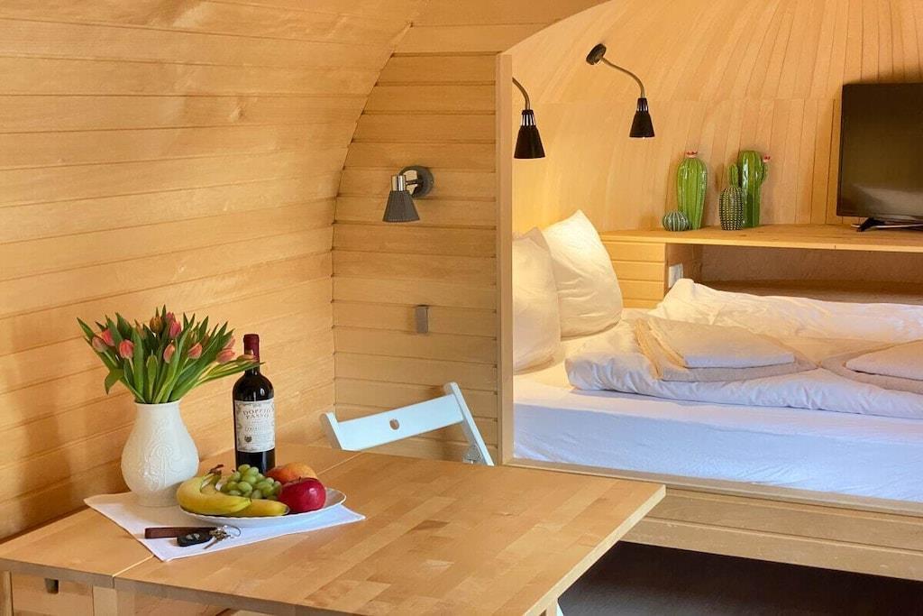 Varför vara vanligt när man kan ha något speciellt? Det lilla huset Igluhut från Estland är det första i södra Tyskland och ligger bredvid semesterhuset Alpenpanorama Chalet, som också har två semesterlägenheter att hyra. Jag blev omedelbart fascinerad av Igluhut. Det är unikt och mycket speciellt; dess 17 kvadratmeter erbjuder allt du behöver för att koppla av på semestern. Iglobastun ligger bredvid Igluhut, och tillsammans ser de ut som en hobbitby. Boendeutrymmet: Igluhut är tillverkat av 100 % naturligt trä. Det yttre lagret av Igluhut är täckt med tre lager granbältros. Invändiga bältros av edelweiss säkerställer ett behagligt inomhusklimat.