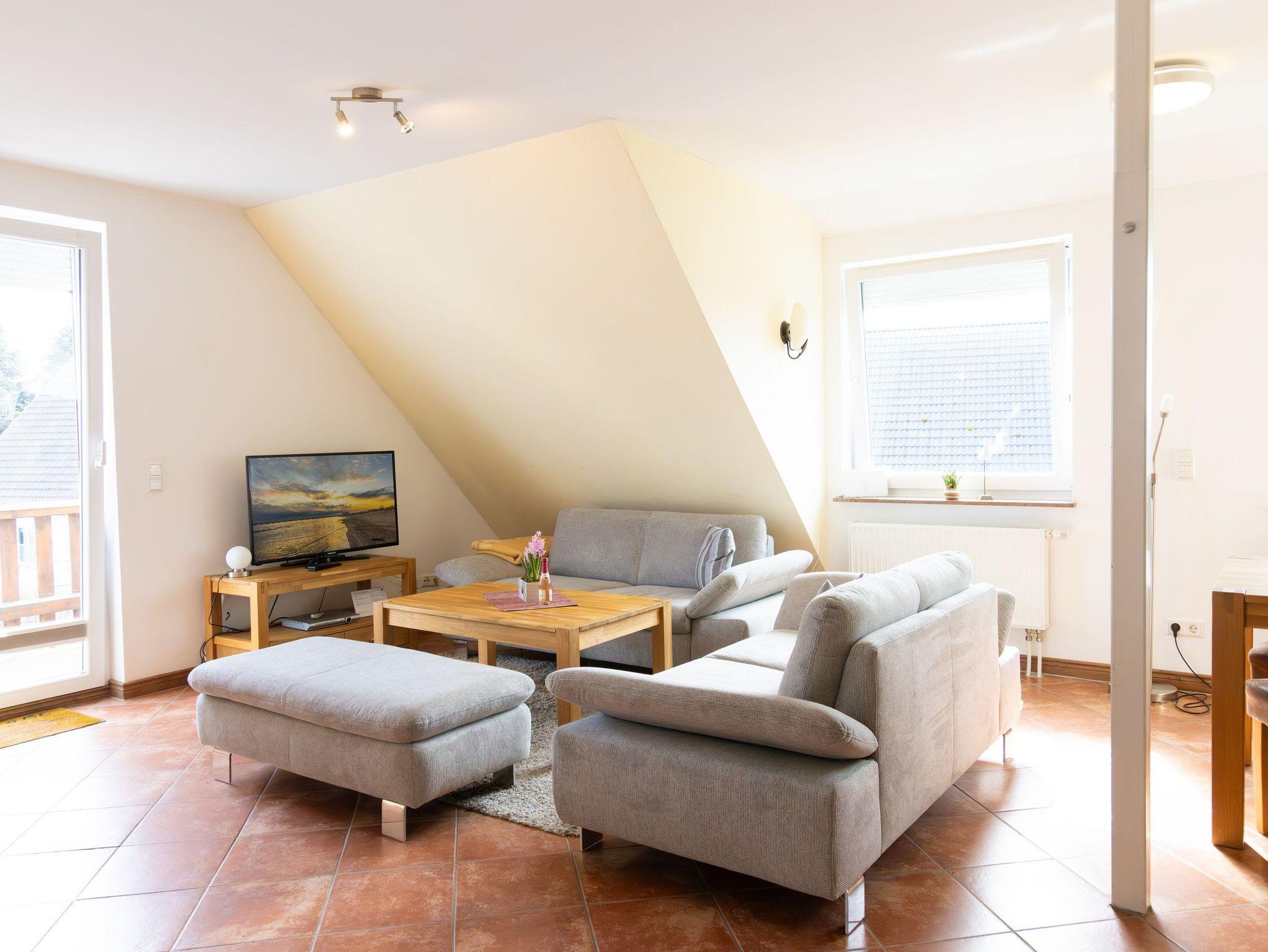Der Wohnbereich mit gemütlicher Sitzecke, Flachbildfernseher und DVD-Player laden zum Entspannen und Ausklingen des Urlaubstages ein. Der angrenzende Südostbalkon rundet den Urlaubskomfort dieses Appartements ab. Zur Nachtruhe oder auch für ein Mittagsschläfchen zwischendurch lassen Sie sich einfach in das bequeme Doppelbett (180 x 200cm / zwei getrennte Matratzen) im Schlafzimmer fallen. Über die freie Treppe erreichen Sie das zweite Schlafzimmer mit Doppelbett (180 x 200cm / zwei getrennte Matratzen) und FlatTV, welches sich im Dachgeschoss des Hauses befindet (zwischen den beiden Schlafräumen befindet sich keine Tür).