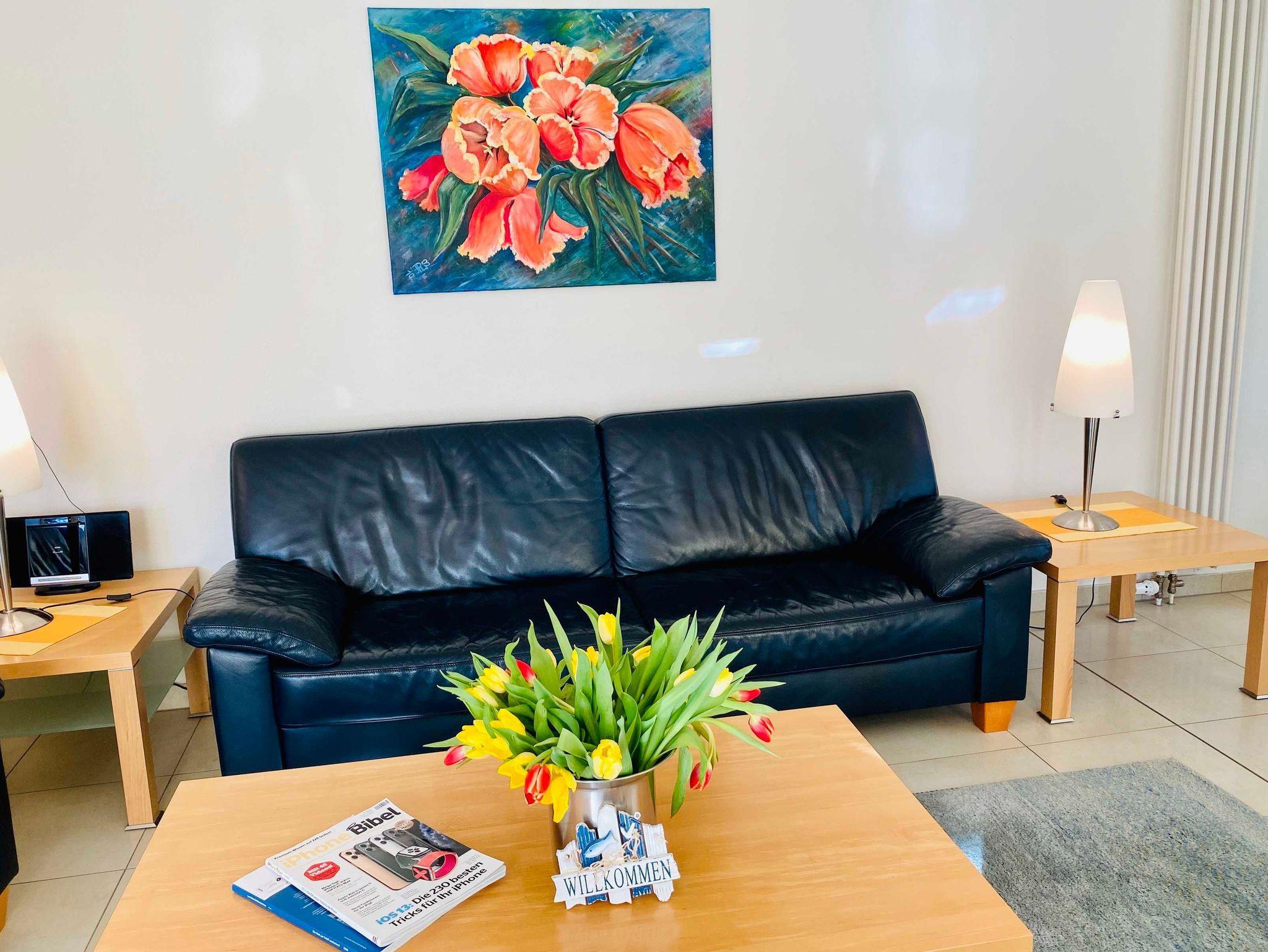 Sie besteht aus einem großzügigen Wohnraum mit Couchecke, TV und Esstisch. Vom Wohnzimmer aus gelangen Sie zur separaten Komplettküche (Geschirrspüler, Mikrowelle, Backofen). Genießen Sie zwei Balkone in Richtung Süd bzw. Promenade mit Blick in den Park der Residenz Bleichröder.