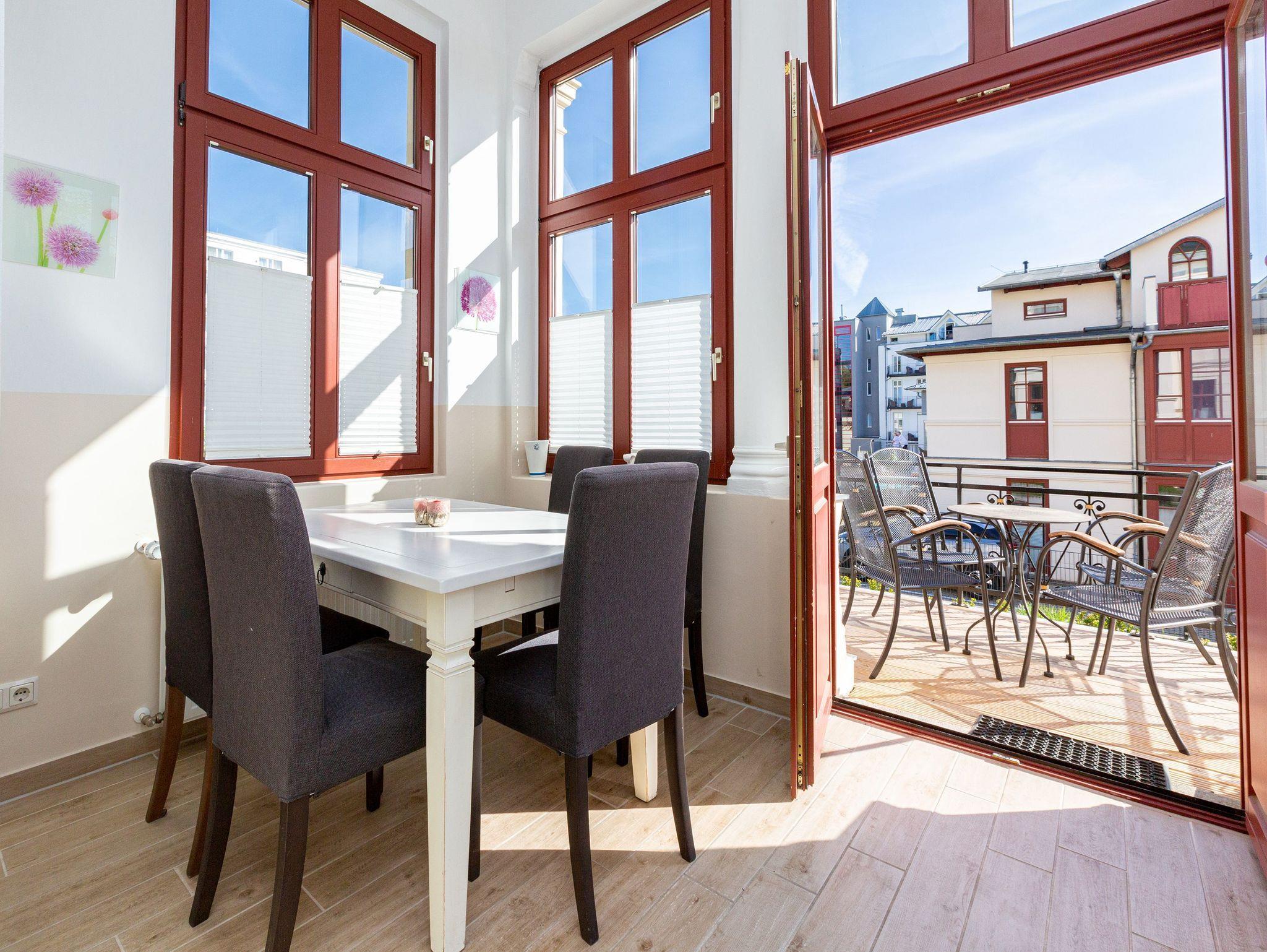 Willkommen in diesem charmanten 3-Raum-Appartement im Hochparterre! Mit einer großzügigen Fläche von 60 qm ist sie ideal für bis zu 3 Personen und ein Kleinkind im Alter von bis zu 3 Jahren (im Kinderreisebett). Hier finden Sie alles, was Sie für einen komfortablen und erholsamen Aufenthalt für Ihren Usedomurlaub benötigen. Das Wohnzimmer lädt mit einer gemütlichen Sitzgruppe und einem TV zum Entspannen und Verweilen ein. Von hier aus gelangen Sie auf die angrenzende Loggia, die Ihnen einen wunderbaren Ausblick bietet. Hier befindet sich auch die Küchenzeile und ein Essplatz. Das Appartement verfügt über zwei Schlafzimmer, die mit einem komfortablen Doppelbett und einem Einzelbett ausgestattet sind. Das Badezimmer ist mit einer Dusche und einem WC ausgestattet. Ein PKW-Stellplatz direkt am Haus ist für Ihren Komfort ebenfalls vorhanden. Auf Wunsch stellen wir Ihnen gerne ein Kinderreisebett (ohne zusätzliche Matratze und Bettzeug) und gegen Aufpreis auch einen Kinderhochstuhl zur Verfügung. Um Ihnen einen stressfreien Start in den Urlaub zu ermöglichen, sind die Betten bei Ihrer Ankunft bereits bezogen und Handtücher liegen für Sie bereit (Erstausstattung). Zudem können Sie unser kostenfreies WLAN-Netzwerk im gesamten Haus nutzen.