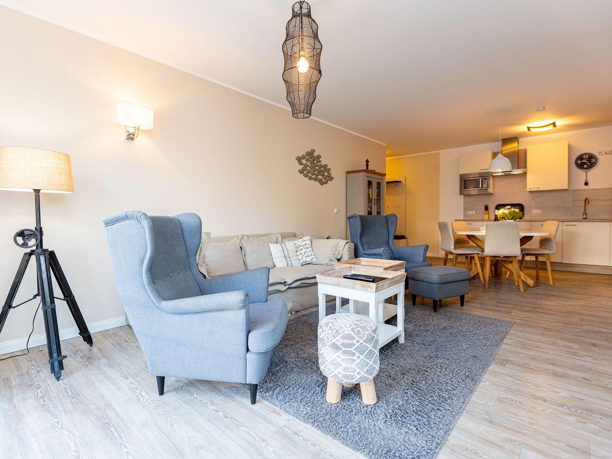 Erholen Sie sich in dieser, im Landhausstil gestalteten, 3-Raum-Ferienwohnung (67 qm) für 2 bis 4 Personen und ein Kleinkind (bis 2 Jahre im Kinderreisebett). Der Eingangsbereich mit Flurgarderobe geht über in die offene, komplett ausgestattete Küche mit rundem, schönen Essplatz. Hier schließt sich der gemütliche Wohnbereich an. Die bequeme Couch und der Flat-TV sind für entspannte TV-Abende bestens geeignet. Ein moderner Elektrokamin sorgt per Knopfdruck für eine kuschlige Wohlfühlatmosphäre. Zwei Schlafzimmer mit bequemen Doppelboxspringbetten (1,80m x 2,00m), Flat-TV (1x mit integriertem DVD-Player) und jeweils geräumigen Schrank sorgen für erholsamen Schlaf. Auf dem Süd-Westbalkon (Zugang vom Wohnbereich und aus einem Schlafzimmer) genießen Sie in den Nachmittags- und Abendstunden die Usedomer Sonne. Ein großes Duschbad mit WC ergänzt das Domizil. Für Ihren Komfort sind die Betten bei der Anreise bezogen und Handtücher liegen bereit. Das WLAN-Netz im Haus kann kostenfrei genutzt werden. Ein PKW-Stellplatz steht in der in der Tiefgarage (max. Einfahrtshöhe 1,93 m) zur Verfügung.