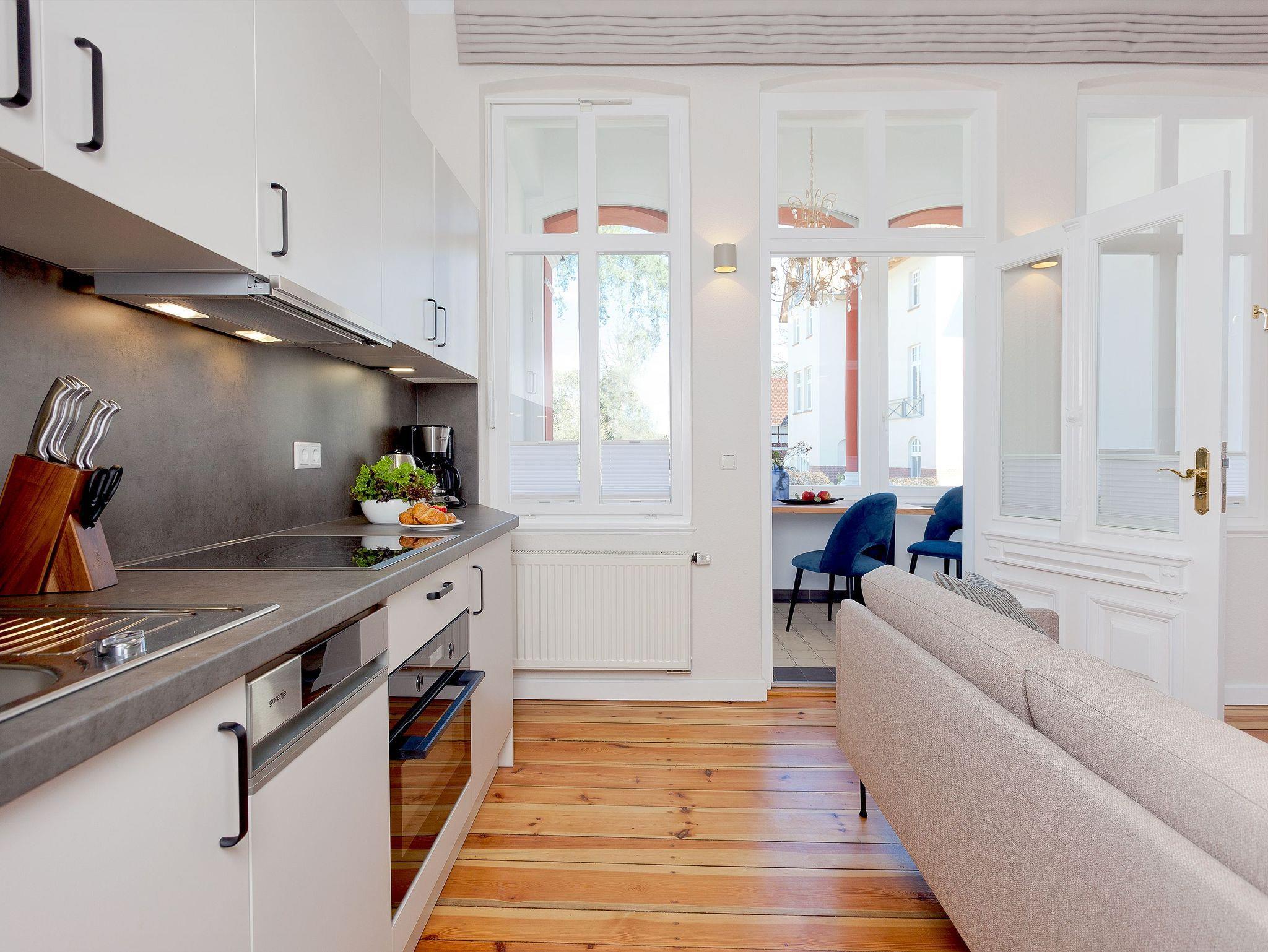 Unser Appartement 7 im 1. Obergeschoss wurde im Winter 2024 - 25 renoviert und erstrahlt nun in neuem Glanz. Mit ca. 37 qm bietet das Appartement alles, was es für einen erholsamen Aufenthalt mit bis zu 3 Personen (2 Erwachsene und 1 Kind bis 8 Jahre) benötigt. Die neue, moderne Single-Küchenzeile ist vollausgestattet mit einem Cerankochfeld, Kühlschrank mit Gefrierfach, Backofen mit integrierter Mikrowelle, Spülmaschine sowie Kaffeemaschine, Wasserkocher und Toaster.