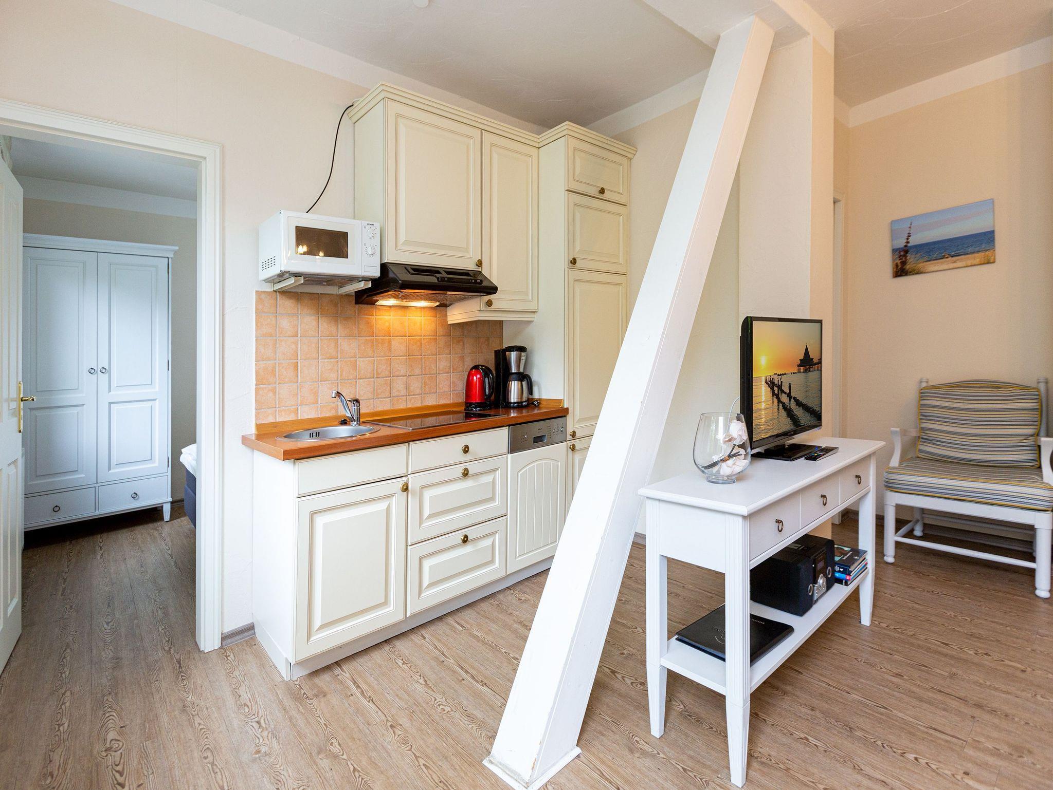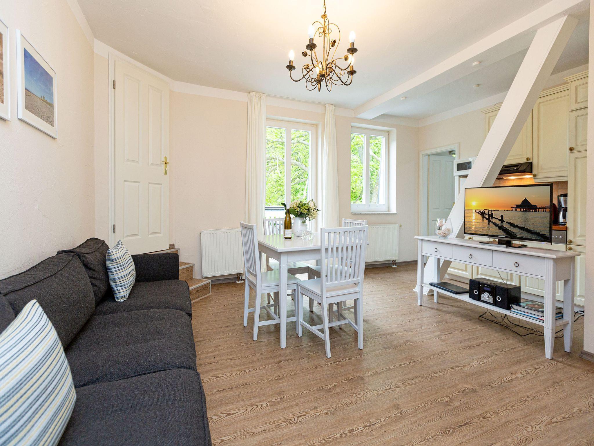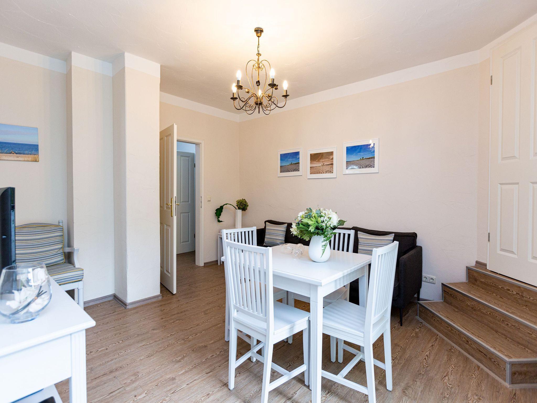 Ein schönes großes und offenes Wohn-Esszimmer empfängt den Urlaubshungrigen beim Eintreten in das Drei-Zimmer-Appartement unter dem Dach der sanierten Bädervilla Amelia. Edle Vintage-Sofas und ein großer Flat-TV warten nur darauf Ihnen eine entspannte Auszeit zu verschaffen. Gemeinsam kochen und essen, ist in diesem 50 Quadratmeter großen Ferienparadies auf jeden Fall möglich. Denn sowohl Küche als auch der in Weiß gehaltene Esstisch eigen sich dafür bestens. Zumal in der Küche alles zu finden ist, was ein Hobbykoch selbst für ein Mehr-Gänge-Menü brauchen kann. Inklusive Geschirr. Vom sonnigen Süd-Balkon aus haben Sie eine herrliche Sicht in die grüne Umgebung. Viel Ruhe finden Sie hier. Die beiden Schlafzimmer ? ausgestattet mit je einem Boxspringdoppelbett ? bringen vergnüglichen und erholsamen Schlaf. Die Schränke bieten viel Platz zum Verstauen. Das Badezimmer hat eine Dusche, ein WC und einen Waschtisch. Für einen rundum entspannten Urlaub sind die Betten bei Ihrer Anreise bezogen und Handtücher liegen bereit. Das WLAN Netz im Haus kann kostenfrei genutzt werden. Ein Pkw-Stellplatz befindet sich am Haus.