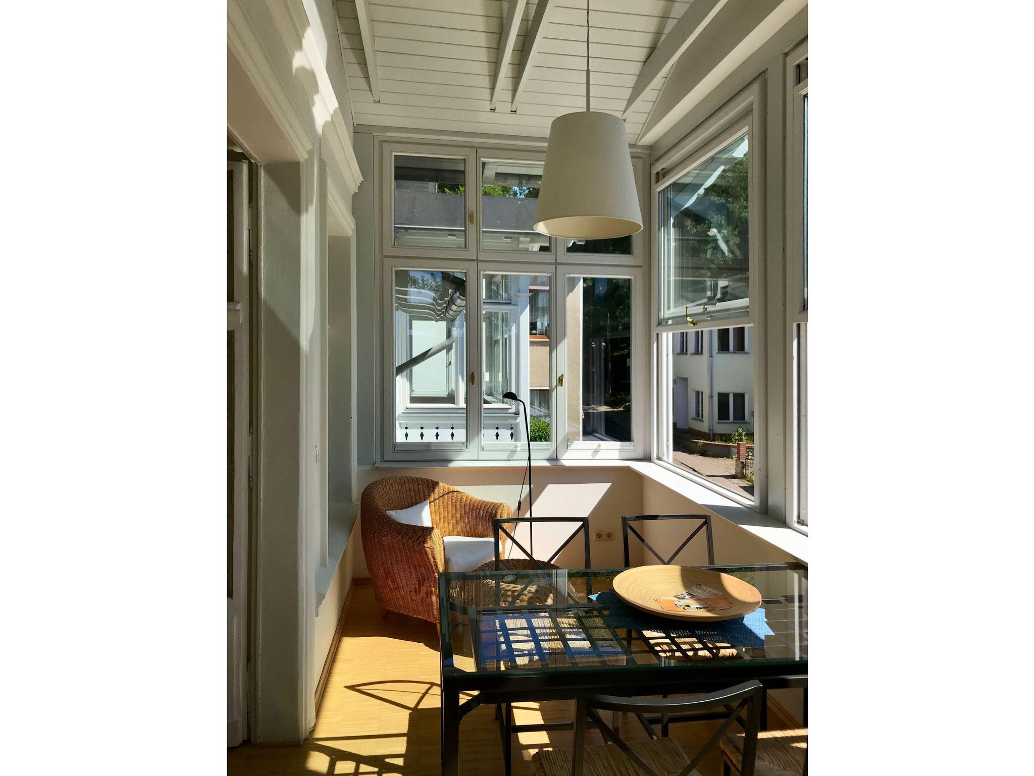 Von diesem ist der Essbereich im wintergartenähnlichen Verandenvorbau abteilbar. Diese nach Süden orientierte Veranda lässt sich durch Schiebefenster komplett öffnen und wie eine offene Loggia nutzen.