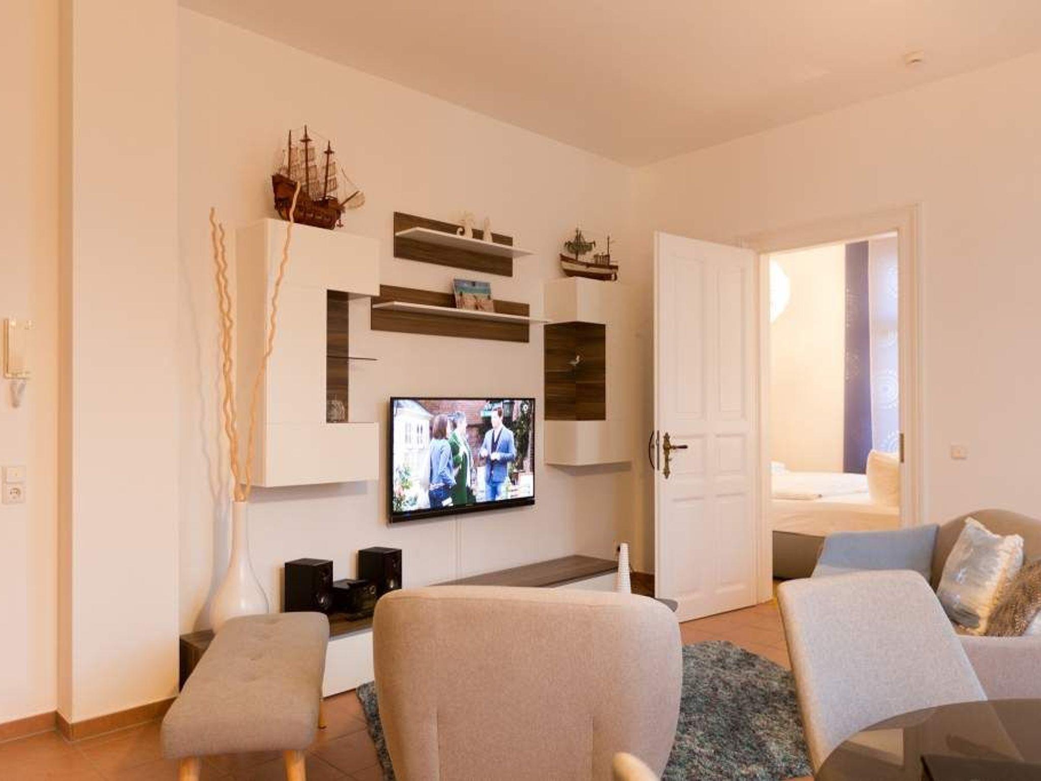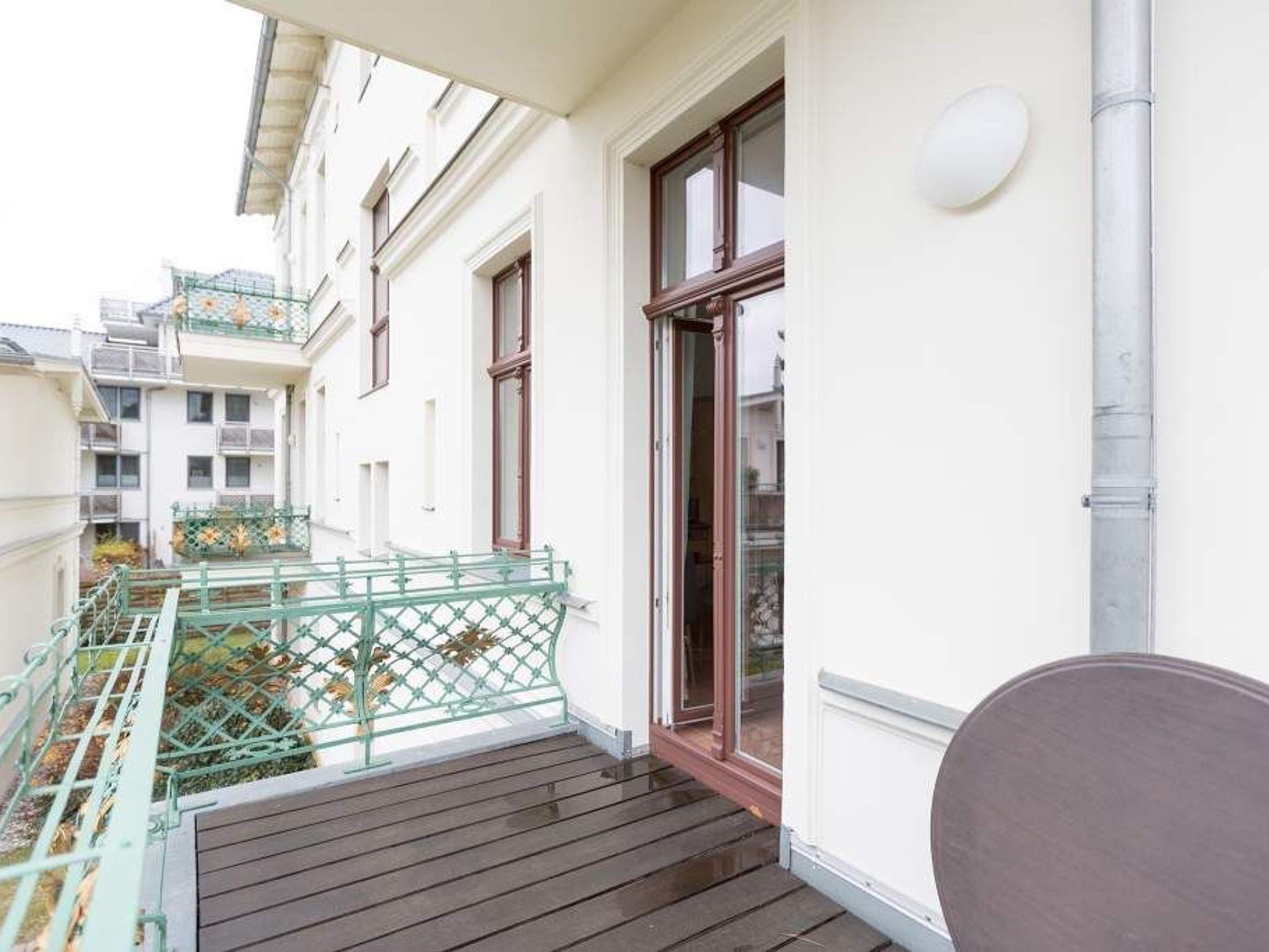 Ein kleines und behagliches Urlaubsparadies ist die Wohnung 8 mit ihren 50 Quadratmetern in der wunderschön sanierten alten Villa Medici in Heringsdorf. In den zwei Zimmern können zwei Erwachsene und ein Kleinkind bis drei Jahre im Kinderreisebett ausspannen, entspannen und sich einfach nur wohlfühlen. Genießen Sie Ihre Auszeit in dem schönen und in modernem Design gestalteten Wohnzimmer ? auf dem Sofa oder dem Sessel. Hier steht auch ein Flat-TV. In den Wohnbereich integriert, ist eine vollausgestattete Küche mit Essbereich. An dem großen Glastisch lässt es sich wunderbar frühstücken oder dinieren. An sonnigen Tagen jedoch ? und das hat Usedom zumeist zu bieten ? lädt ein schöner Südbalkon zum Verweilen und Essen ein. Das Schlafzimmer verfügt über ein großes und bequemes Boxspringdoppelbett (1,80 m x 2,00 m) und im Kleiderschrank über viel Ablagefläche. In das Zimmer passt auch ein Kinderreisebett hinein. Das Badezimmer ist überaus geräumig, wartet neben dem Waschtisch und WC sogar mit einer Badewanne mit Duschfunktion und einem Bidet auf. Für einen rundum sorglosen Urlaub liegen Handtücher bereit und das Bett ist bezogen. Zum Appartement gehört ein Pkw-Außenstellplatz. Das WLAN-Netz ist kostenfrei nutzbar.