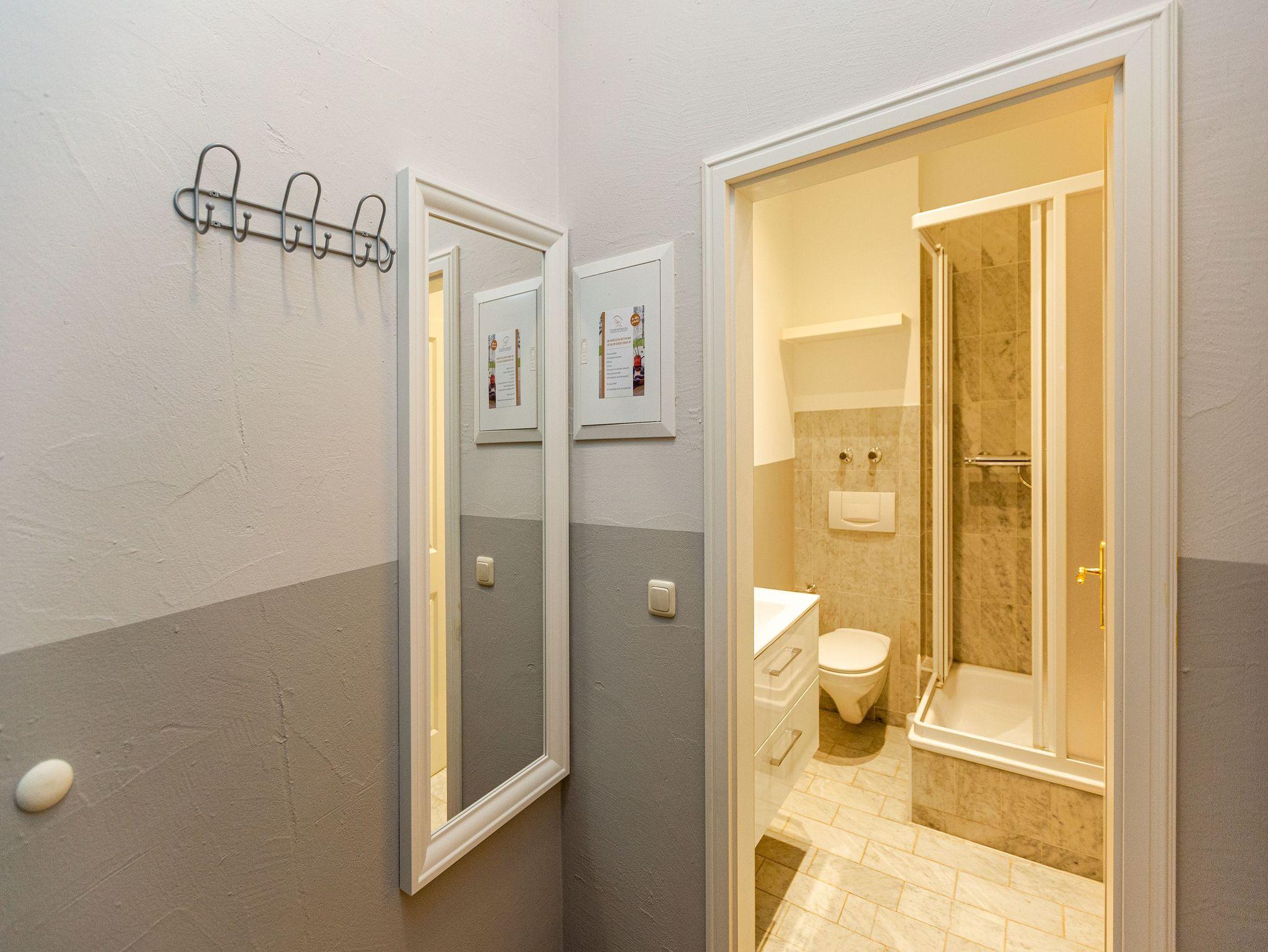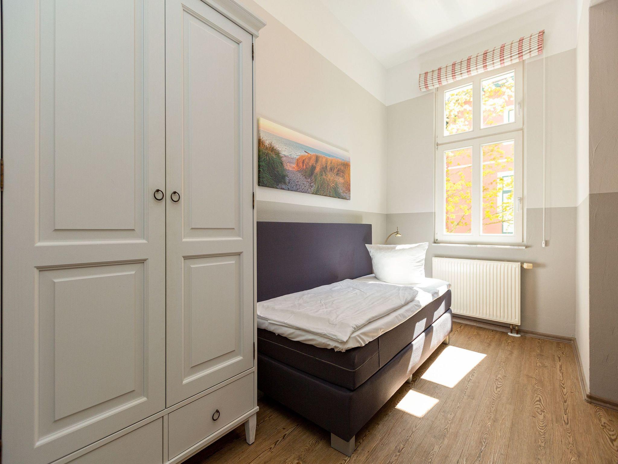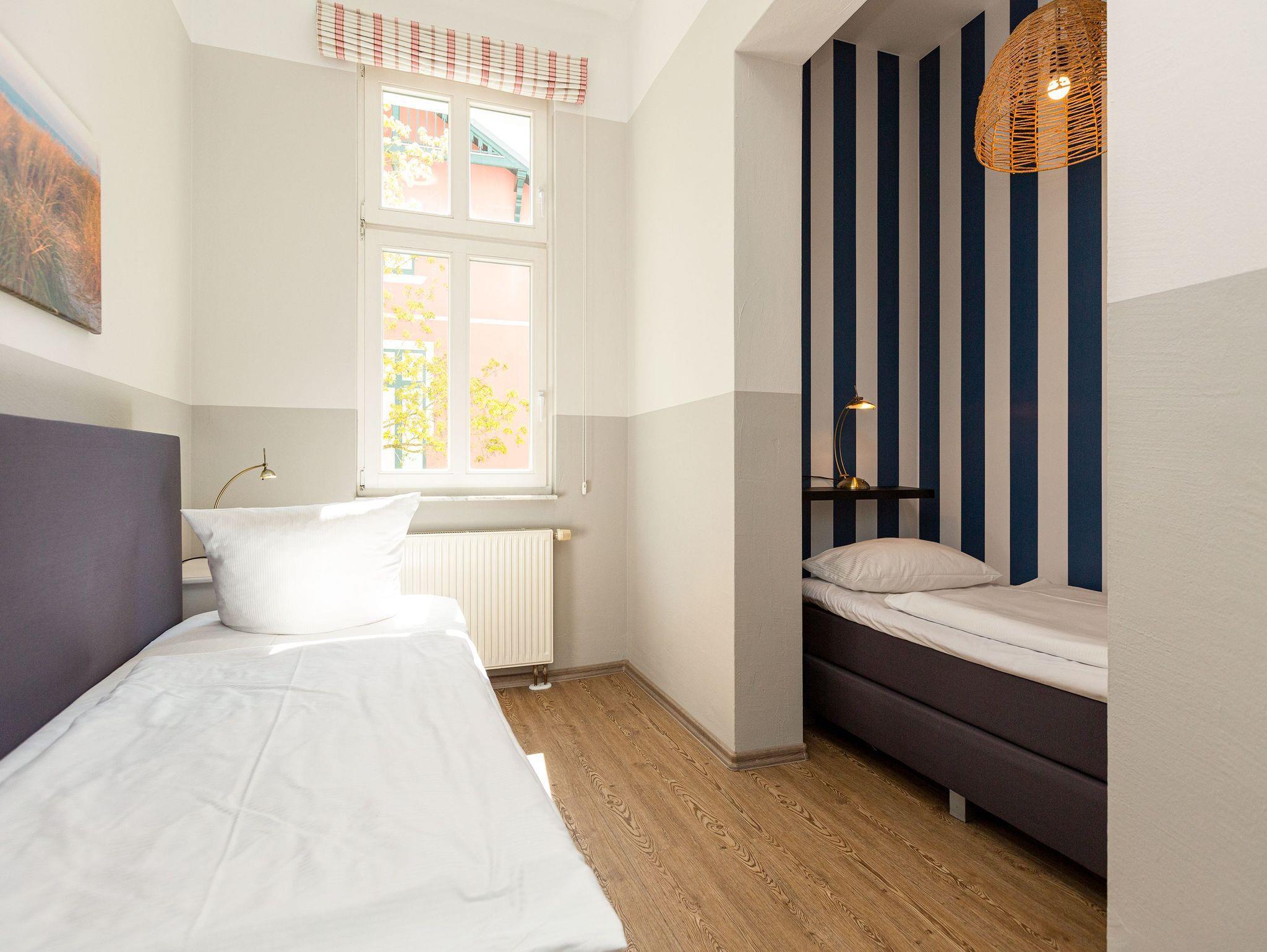 Morgens bei lichter Sonne erwachen in einem komfortablen und kuscheligen Boxspringdoppelbett. Das einzige, was zu hören ist, sind die Vögel in den Bäumen und von ganz ferne das leise Rauschen der Ostsee. So kann ein Urlaubstag beginnen. Und so beginnt er in dem schönen Drei-Zimmer-Appartement Nr. 8 im 1. Stock der Villa Amelia garantiert. Hohe und helle Räume lassen das Gefühl von Leichtigkeit und Unbeschwertheit aufkommen. Mit edlen Vintage-Möbeln eingerichtet, verströmt das Urlaubsdomizil auf seinen 50 Quadratmetern das Laissez-faire einer mondänen und längst vergangenen Zeit. Ohne den Komfort und die Technik von Heute vermissen zu lassen. So sorgt ein großer Flat-TV für Unterhaltung. Die Küche - separat, doch offen - ist mit allen Geräten und feinem Geschirr ausgestattet. In den zwei Schlafzimmern können bis zu 3 Erwachsene [&] 1 Kind bis 15 Jahre Ruhe finden. Ein Schlafzimmer verfügt über ein Boxspringdoppelbett, das andere über zwei einzeln stehende Boxspringbetten. Das Marmor-geflieste Bad hat ebenfalls Charme und ist mit Dusche, WC und Waschtisch ausgestattet. Vom Wohnzimmer und von der Küche aus geht?s auf einen kleinen Balkon. Hier können Sie gemütlich essen, trinken und einfach das viele Grün um Sie herum genießen. Und für einen rundum sorglosen Urlaubsgenuss ist ebenfalls gesorgt. Denn Ihre Betten sind bei Anreise bereits bezogen und Handtücher liegen für Sie bereit. Das WLAN Netz im Haus kann kostenfrei genutzt werden. Für Ihr Auto steht Ihnen am Haus ein Stellplatz zur Verfügung.