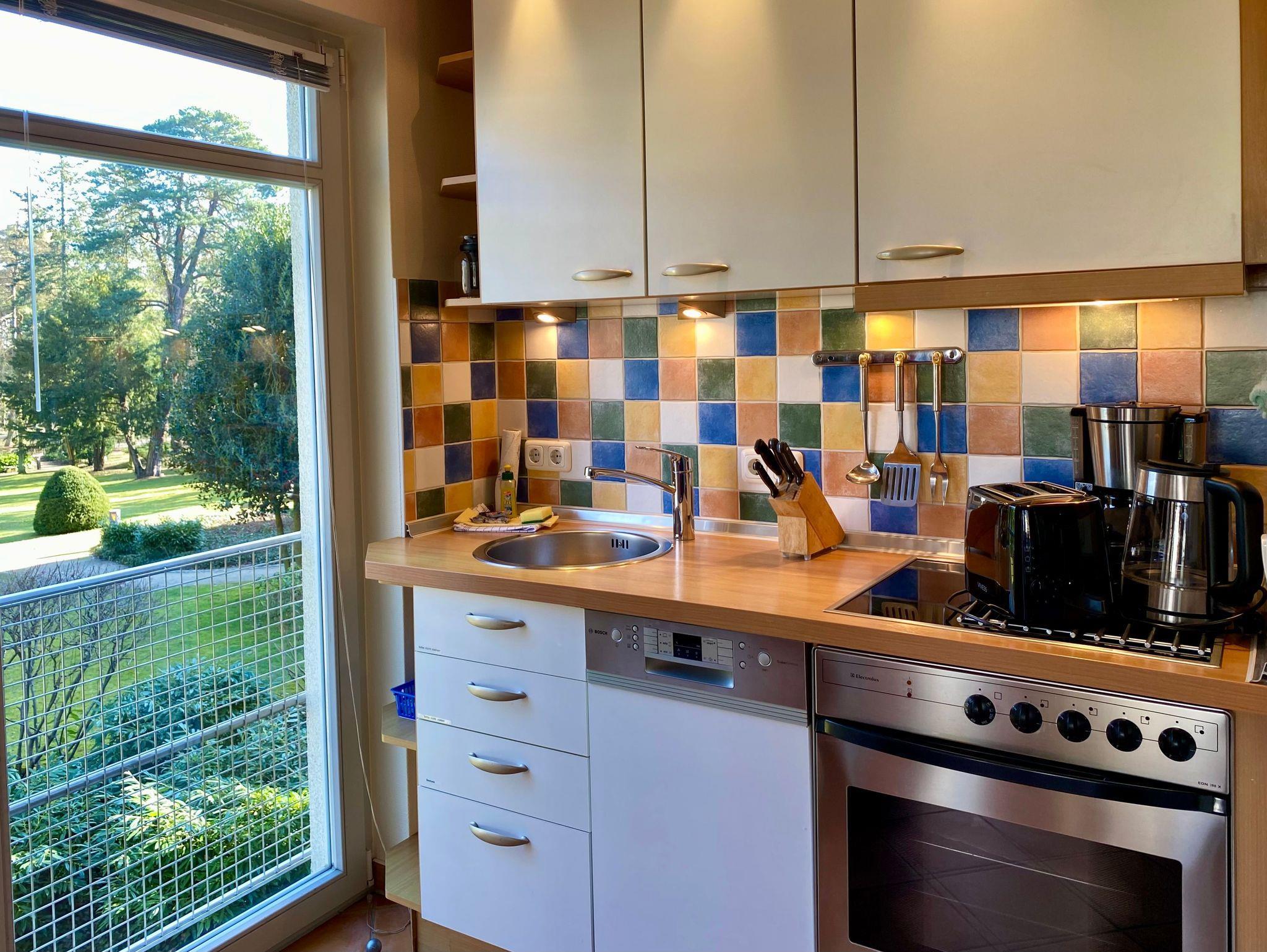 Genießen Sie Ihren Urlaub in dieser schönen 3-Raumwohnung Nr. 11 mit Balkon Richtung Park der Residenz Bleichröder. Der Wohnraum bietet durch eine funktionale Aufteilung zwischen Küche, Esstisch und Couchecke genug Platz für die gesamte Familie. In der Küche stehen Geschirrspüler., Backofen/Herd, Mikrowelle und ein großer Kühlschrank mit Gefrierteil zur Verfügung. Beide Schlafzimmer sind mit Doppelbetten versehen, im großen Schlafzimmer gibt es einen 2. TV. Diese moderne Ferienwohnung ist komplett mit Terracotta-Steinfliesen ausgelegt, sehr praktisch. Zur Ferienwohnung gehört ein Bad mit Dusche.
