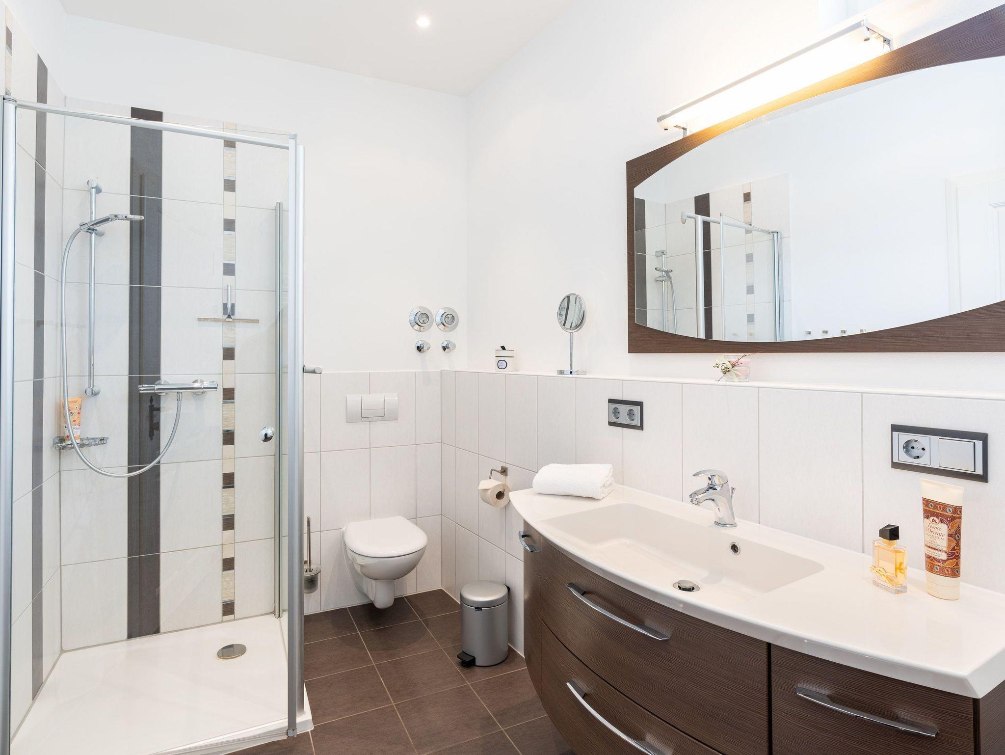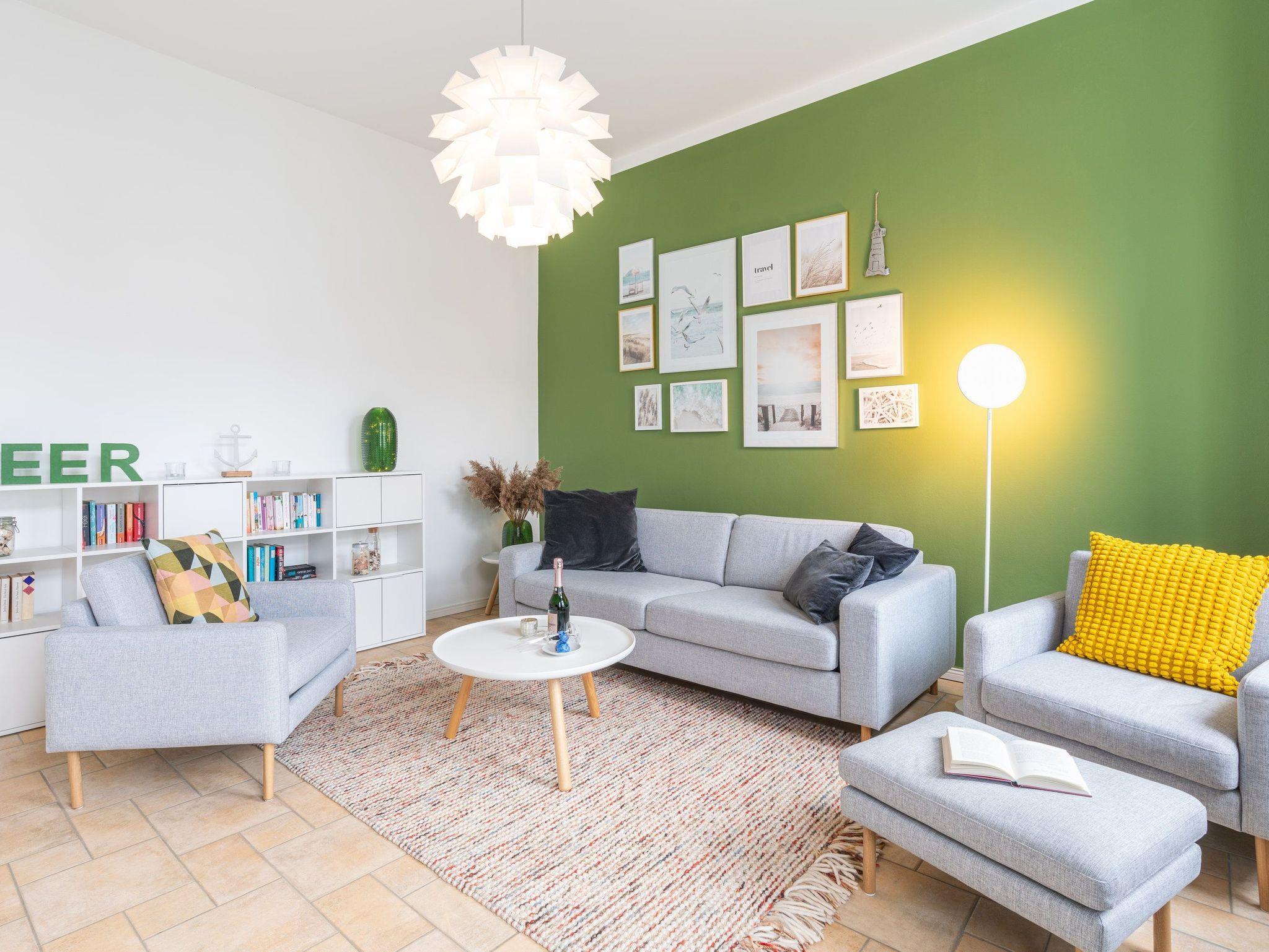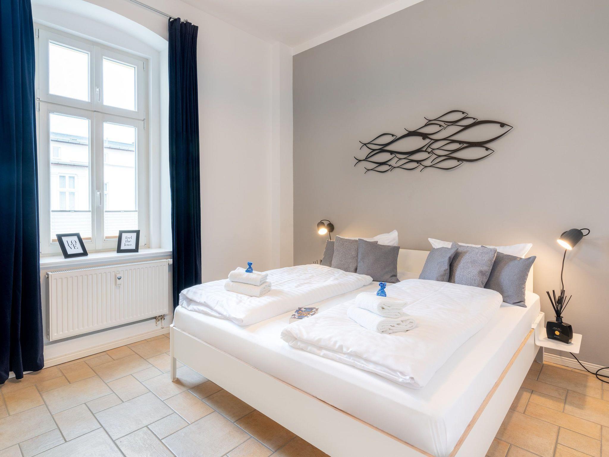 Im 1. OG der Villa Monico gelegen, hat sie einen schönen Süd-Ost-Balkon von welchem Sie aus schon morgens beim ersten Kaffee einen Blick auf die Ostsee werfen können. Bei der Renovierung ist Wert auf hochwertige Designmöbel sowie eine geschmackvolle Atmosphäre gelegt worden. Ideal zum Relaxen ist das geräumige und helle Wohnzimmer, welches Sie durch eine Doppelflügeltür betreten. Von der bequemen Sitzgruppe, oder dem Liegesessel aus haben Sie Blick auf den großen Flat TV (55 Zoll). Ein kostenloser Netflix-Zugang ist bereits enthalten und bietet somit auch an grauen Herbsttagen eine schöne Abwechslung.