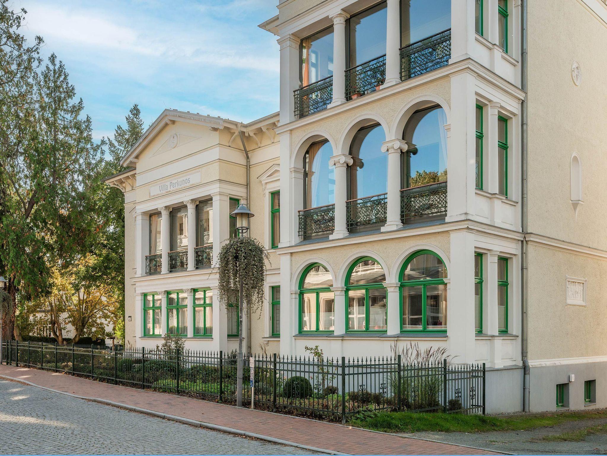 Die Villa Perkunos erstrahlt im Glanz alter Bäderstilzeiten und verbindet historischen Charme mit modernem Komfort. Die strandnahe und dennoch zentrale Lage in Heringsdorf macht die Unterkunft zu einem idealen Domizil für jeden Usedomurlauber. Die 3-Raum-Ferienwohnung Nr. 11 befindet sich in der „Bel Etage“ des Hauses, dem früher bevorzugten Geschoss für Adlige oder Großbürger. Auf ca. 58 m² bietet sie Platz für bis zu 5 Personen. Ein überdachter PKW-Stellplatz, WLAN sowie Waschmaschine und Trockner (gegen Gebühr) stehen zur Verfügung. Das Grundstück ist umzäunt und durch ein elektrisches Tor gesichert, und Fahrräder können in der sicheren Abstellmöglichkeit im Keller untergebracht werden.