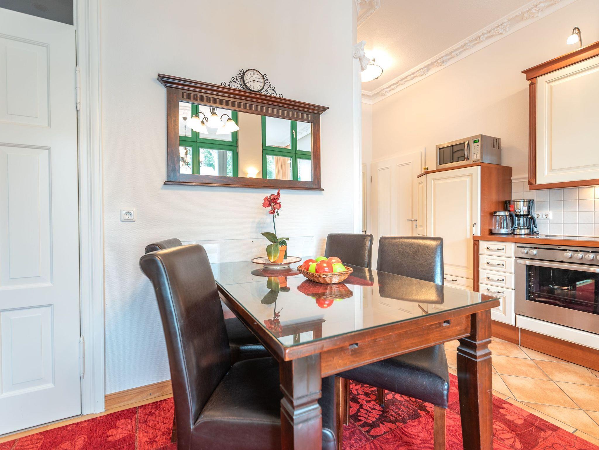 Die Wohnung ist komplett ausgestattet und überzeugt mit einem geschmackvoll gestalteten Küchen- und Essbereich. In der verglasten Loggia laden eine gemütliche Sitzgruppe und eine Leseecke zum Entspannen ein. Für Unterhaltung sorgt ein moderner Flachbild-TV ? noch schöner ist es jedoch, im komfortablen Lehnsessel bei einem Glas Wein den Blick über die umliegende Bäderarchitektur schweifen zu lassen. Für unsere kleinen Gäste können auf Wunsch ein Kinderreisebett und ein Kinderhochstuhl kostenfrei bereitgestellt werden.
