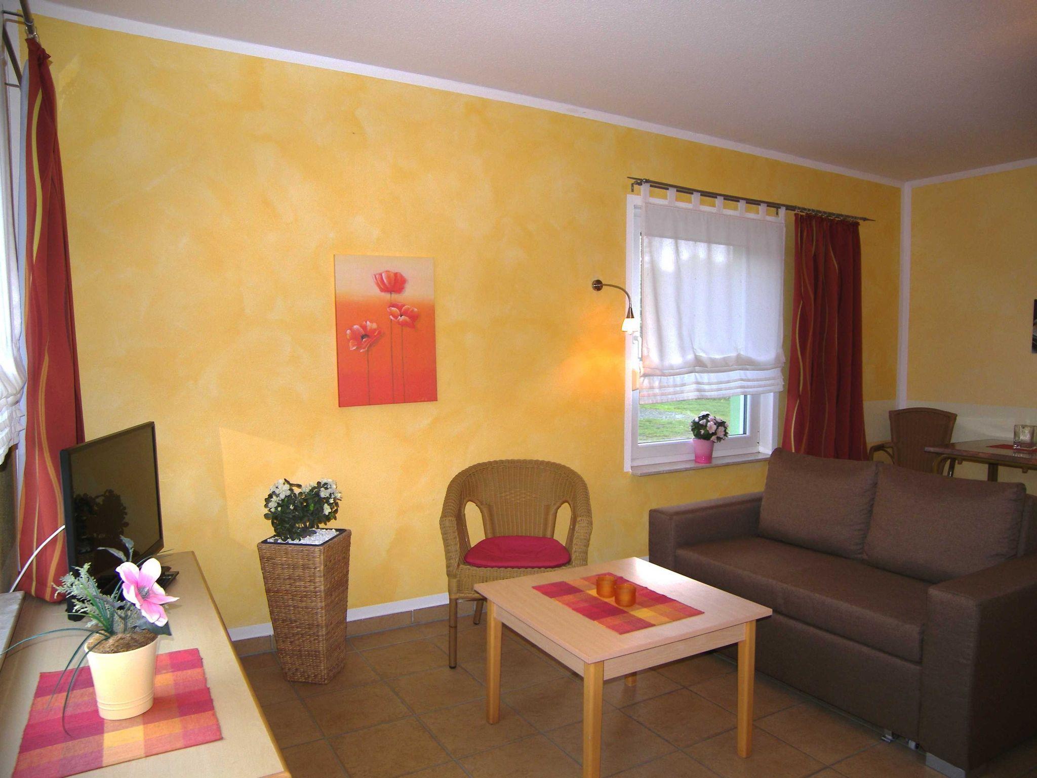 Die moderne, komfortable und barrierefreie Nichtraucher- Ferienwohnung ist für Rollstuhlfahrer geeignet. Sie liegt in parterre und ist stufenlos zu erreichen. Der kombinierte Wohnraum verfügt über eine Schlafcouch (Aufbettung für eine 3. Person), TV und Radio. Die integrierte Küchenzeile ist mit einer Mikrowelle, 4 Platten Cerankochfeld, Kühlschrank mit Gefriermöglichkeit, Geschirr, Wasserkocher, Toaster und Kaffeemaschine ausgestattet.