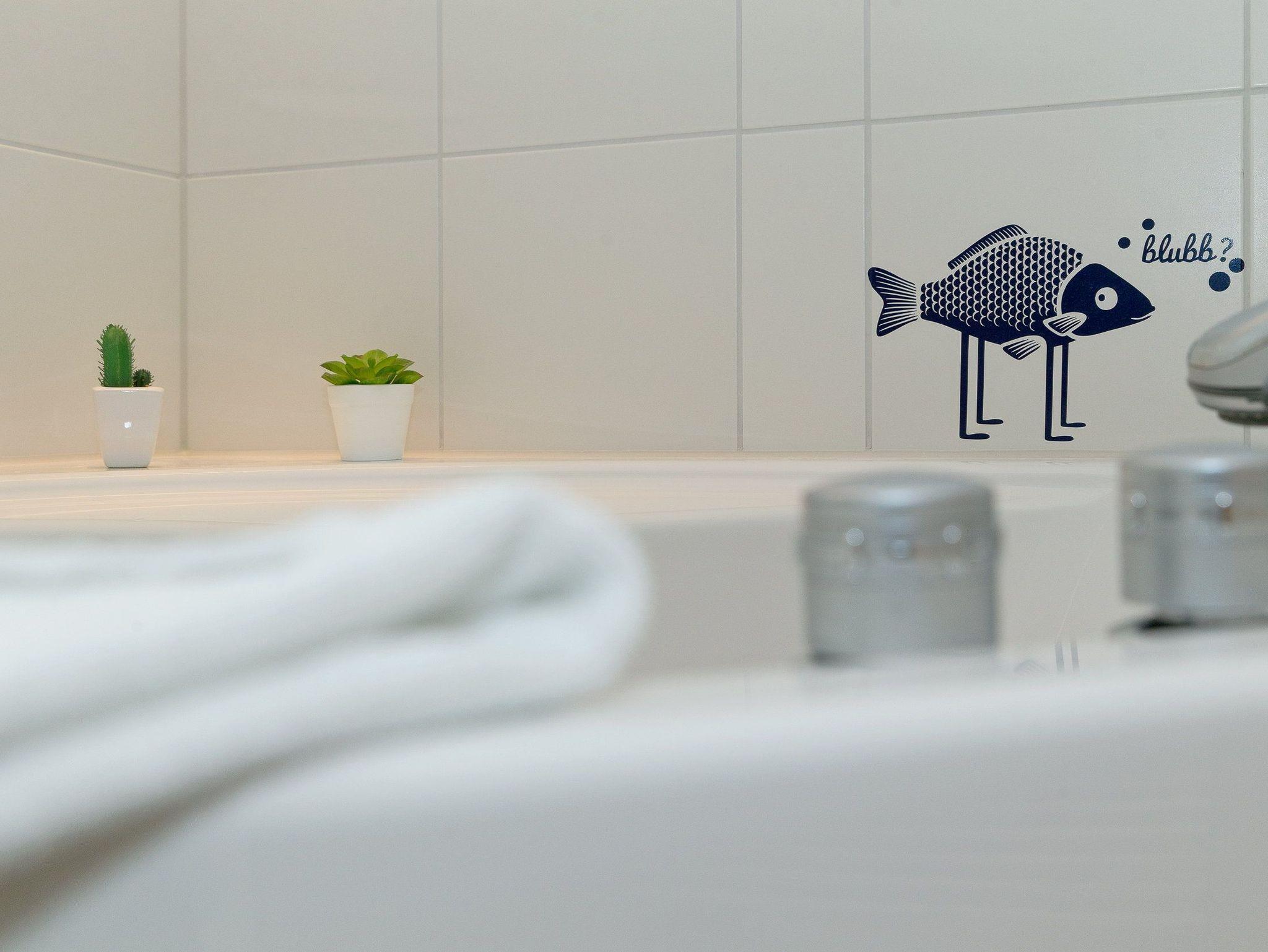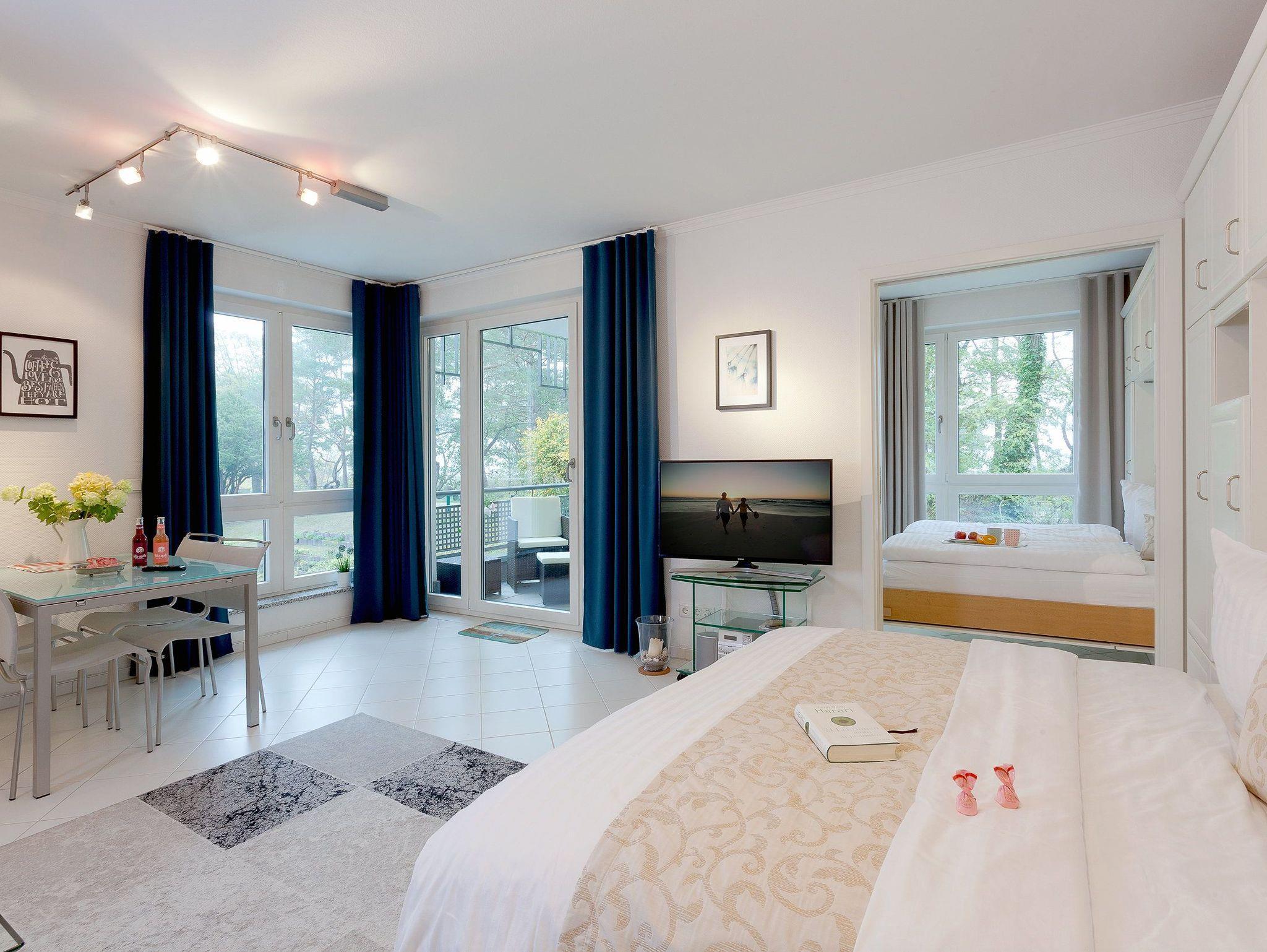 Vom Flur des Appartements haben Sie Zugang zu dem modernen Wohnbereich sowie zu den zwei Bädern, eines mit Dusche/WC und eines mit Badewanne/WC und einem Haarfön. Die Küche, die Sie vom Wohnbereich erreichen, bietet alle Raffinessen (Backofen, Kühlschrank mit Gefrierfach, Geschirrspüler, Mikrowelle, Wasserkocher, Toaster, Kaffeemaschine), die Sie für die Zubereitung Ihrer Lieblingsspeisen benötigen. Dank eines komfortablen Schrankbettes (160 x 190cm / zwei getrennte Matratzen) im Wohnbereich, dass Sie für die Nachtruhe im Handumdrehen in eine Schlafstätte für zwei Personen verwandeln und tagsüber einfach einklappen, und dem bequemen Doppelbett (160 x 190cm / zwei getrennte Matratzen) im Schlafzimmer, können bis zu vier Personen gut erholt und ausgeruht in einen neuen Urlaubstag starten.