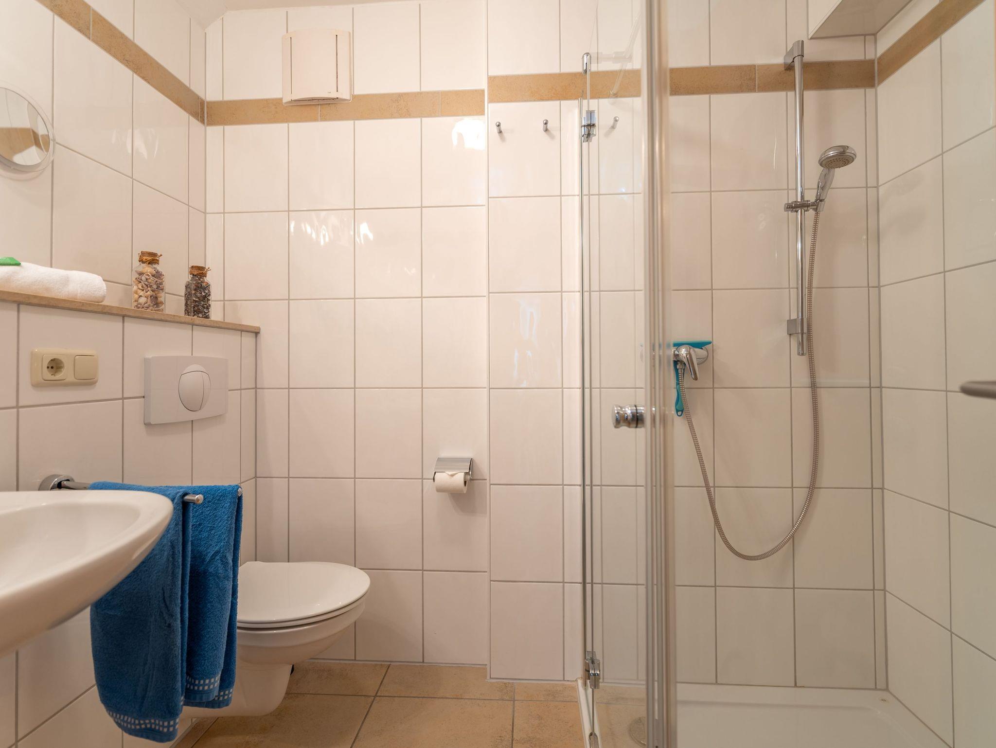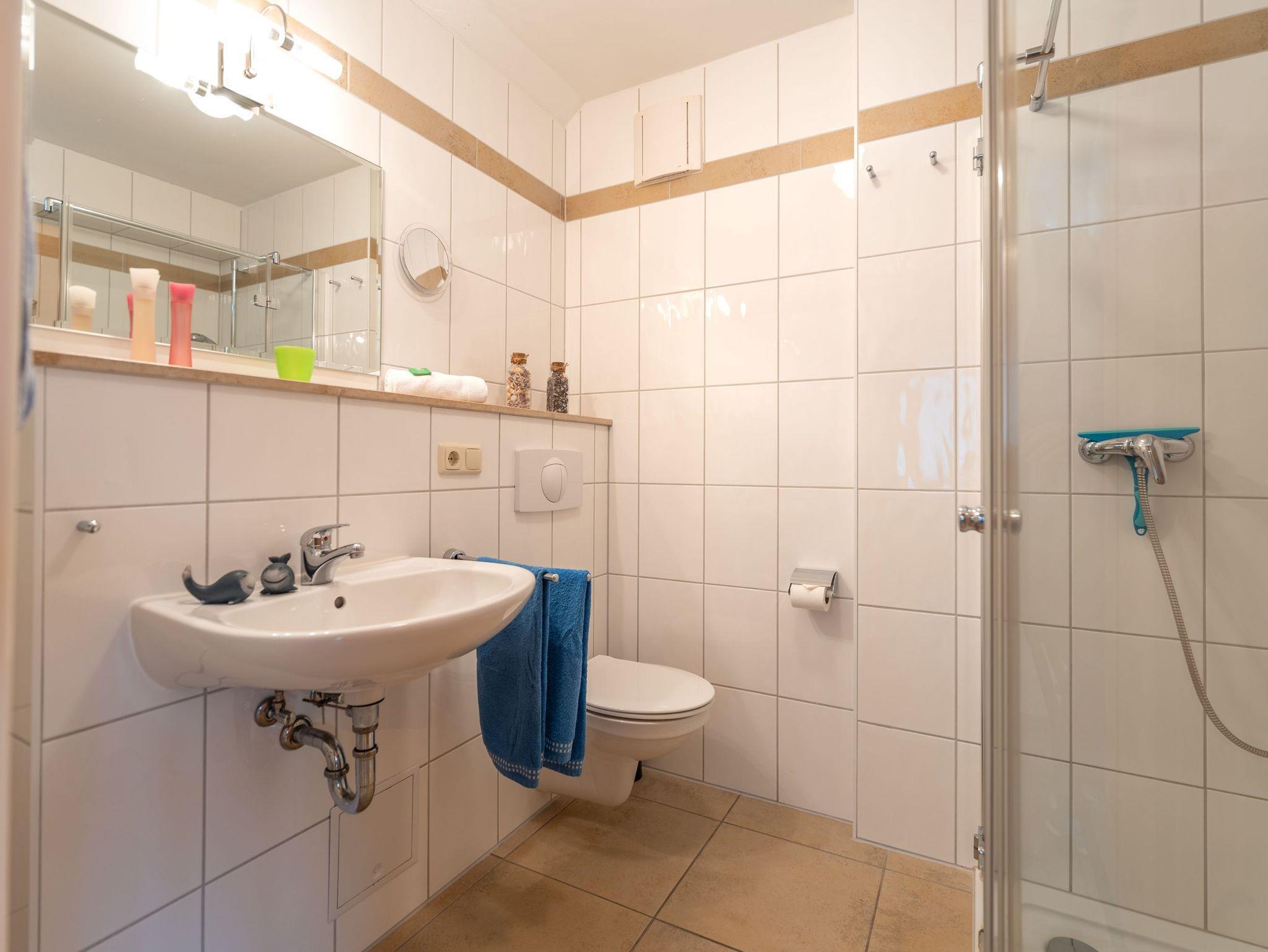 Das Badezimmer ist modern und mit einer Dusche und einem WC ausgestattet. Zusätzlich steht Ihnen im Haus ein Hauswirtschaftsraum zur Verfügung, in dem Sie nach Absprache eine Waschmaschine und einen Trockner gegen eine kleine Gebühr nutzen können.